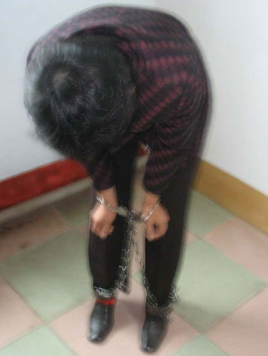 本人模拟演示:戴连体手铐脚镣(10多斤重)不能自己上厕所,走路直不起腰来