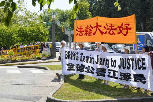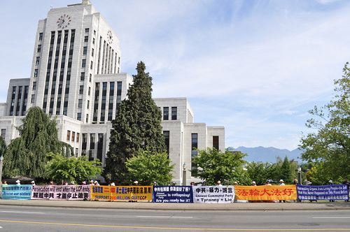 ![]() 温哥华法轮功学员在市政厅前沿街拉起横幅,责令中共停止迫害 |