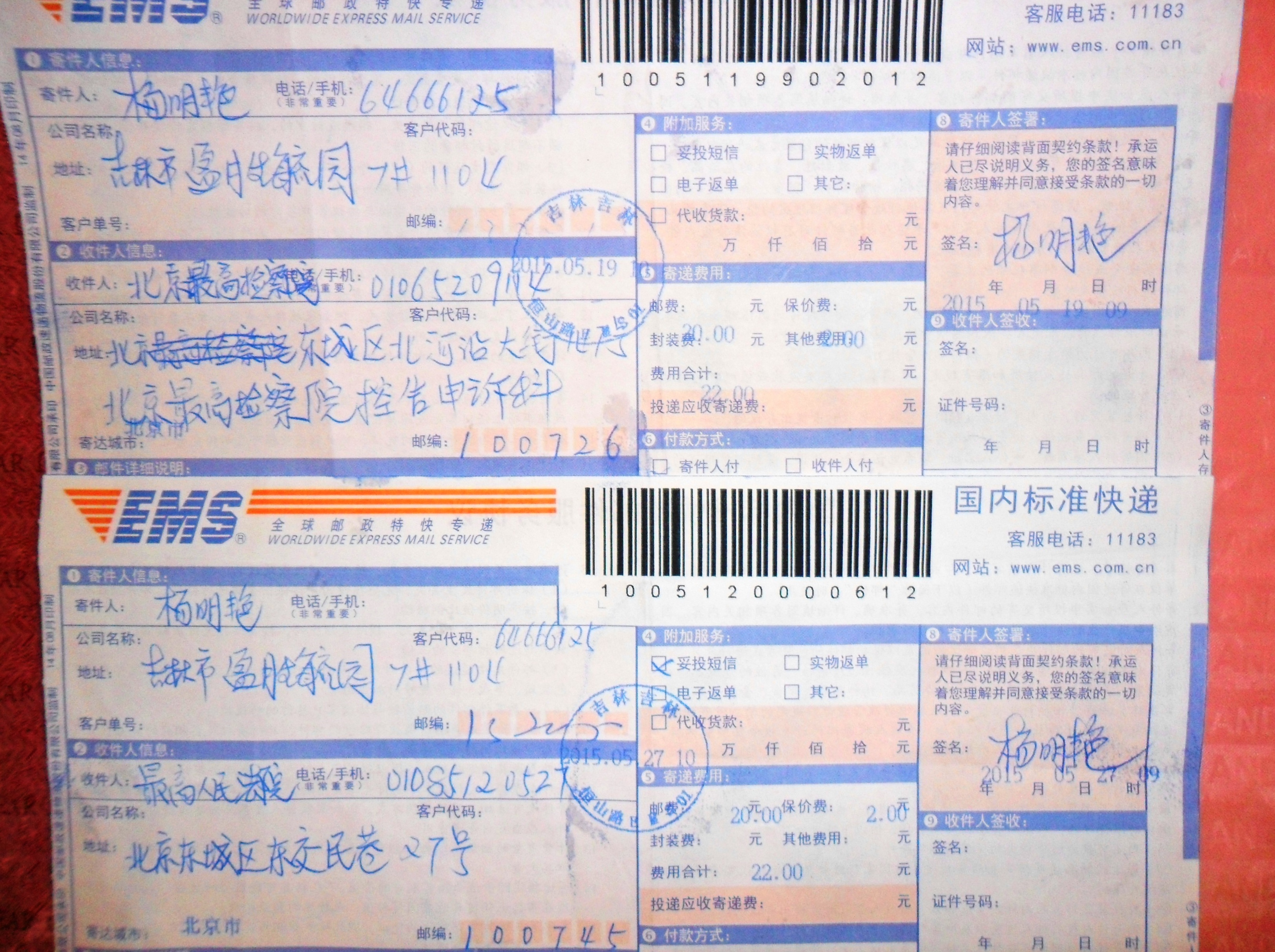 梁宝范、刘俊梅夫妻和女儿梁晶邮寄诉状的收据