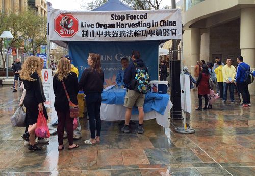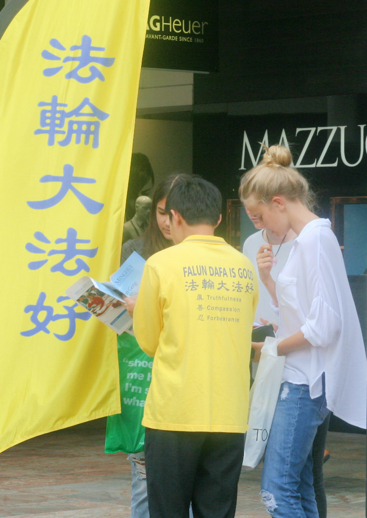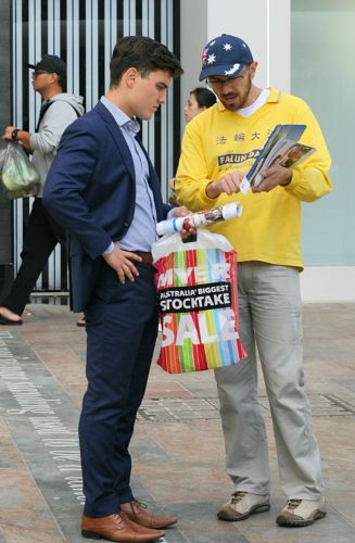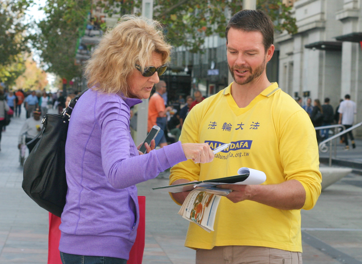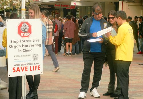六月二十日,珀斯部分法轮功学员在市中心讲真相,很多人听闻《活摘》片中主角——加拿大人权律师大卫•麦塔斯(David Matas)即将访问珀斯的消息后,纷纷表示他们已经或将联络澳洲外长茱莉•毕晓普(Julie Bishop)女士,要求她会见麦塔斯先生,直面中共活摘器官的罪恶,并采取行动制止它。