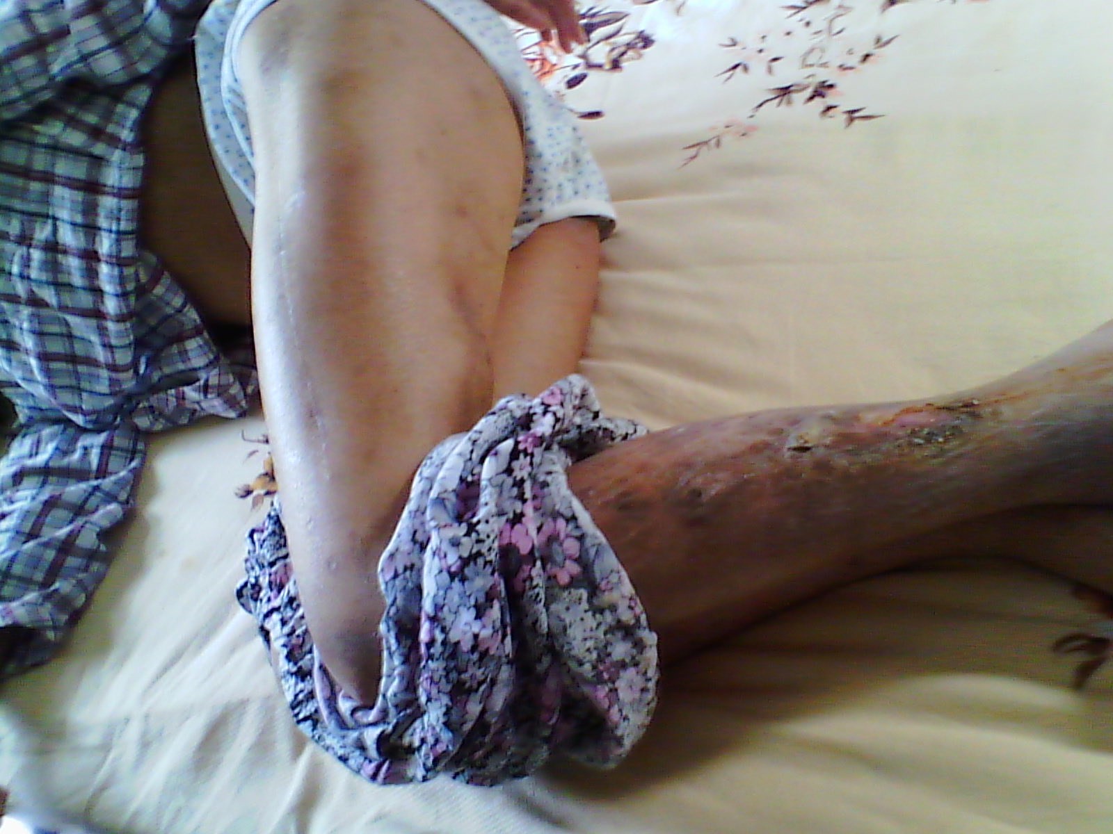 ![]() 苏南被迫害大腿骨折后四年,小腿上至今留下的溃疡面,一直在往外渗组织液,因身体虚弱,医院不敢动手术取出钢板 |
