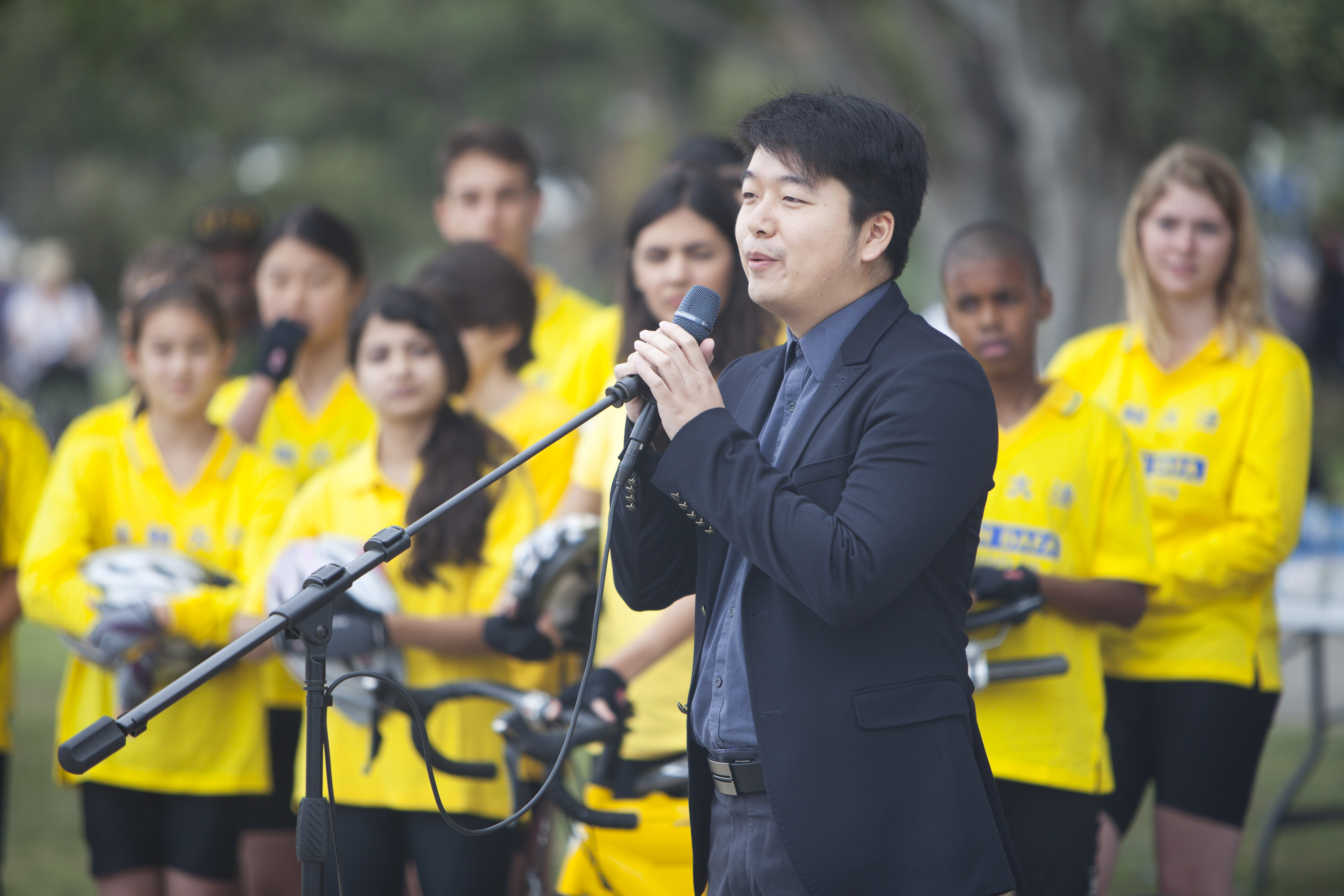 队长Annie Chen(右)向到场支持的民众介绍“骑向自由”(Ride to Freedom) 少年单车队队员。
