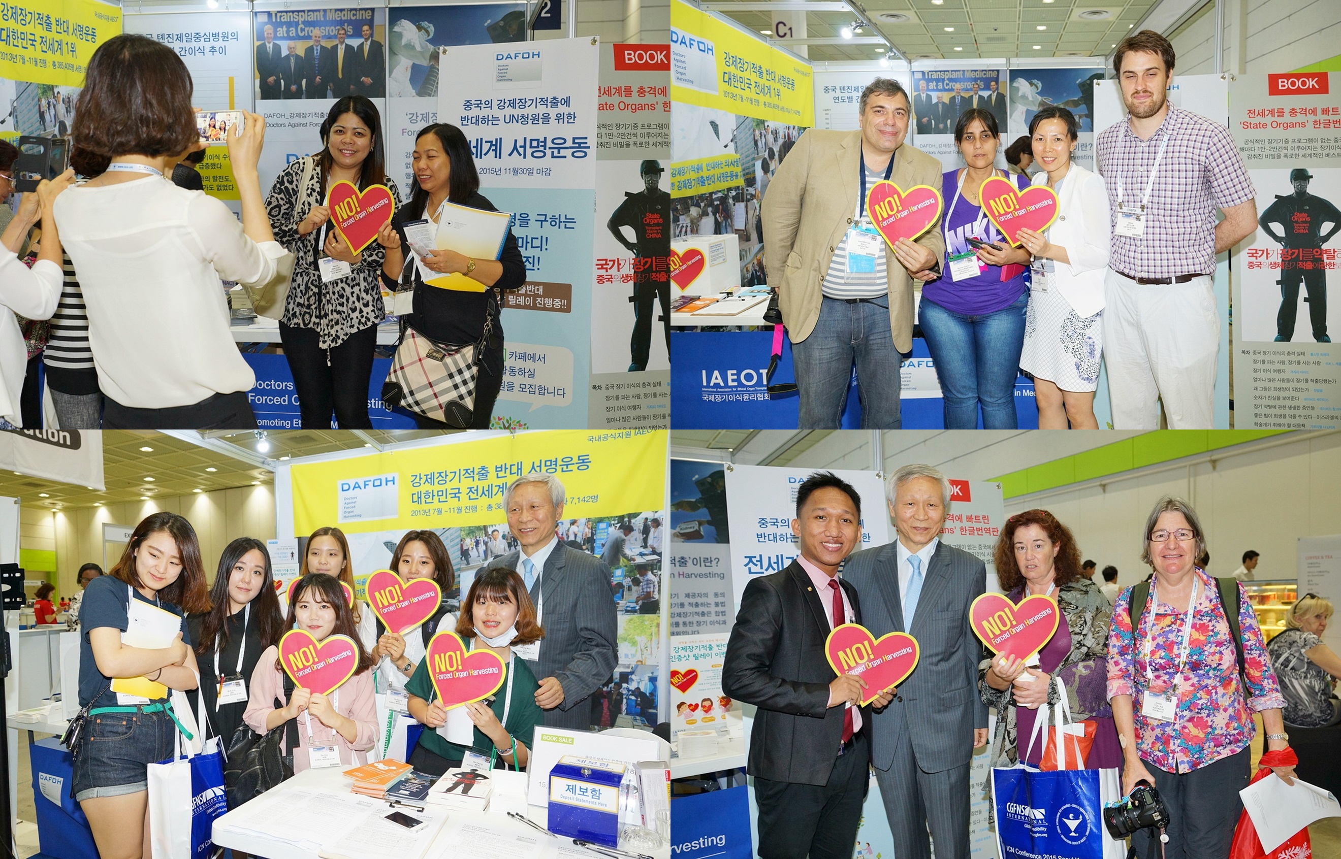 大会期间,韩国非政府组织“国际脏器伦理协会”(IAEOT)与反对强摘器官的国际医师团体“DAFOH”来此共同设立展位,曝光中共活摘法轮功学员器官的暴行,并征集签名呼吁联合国制止中共强摘法轮功学员器官的罪行。