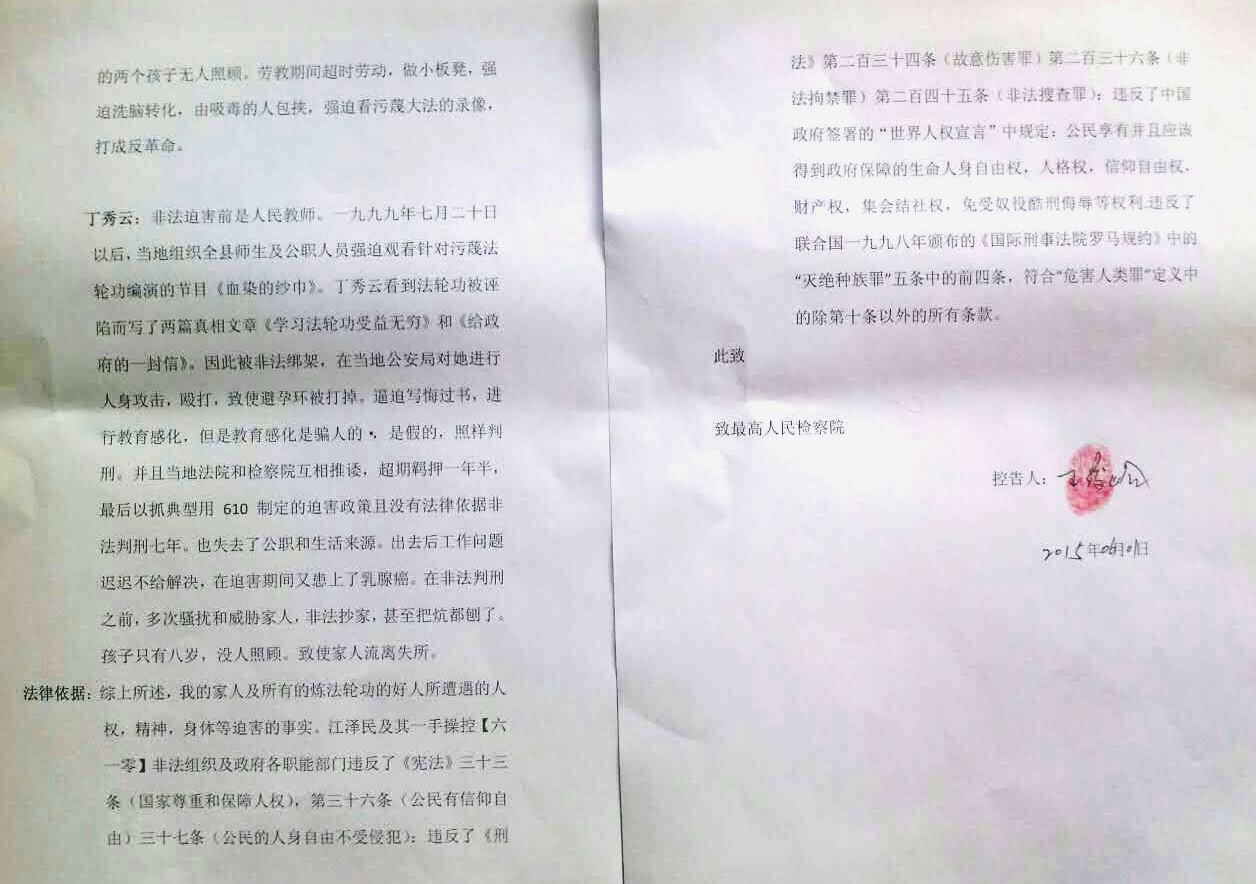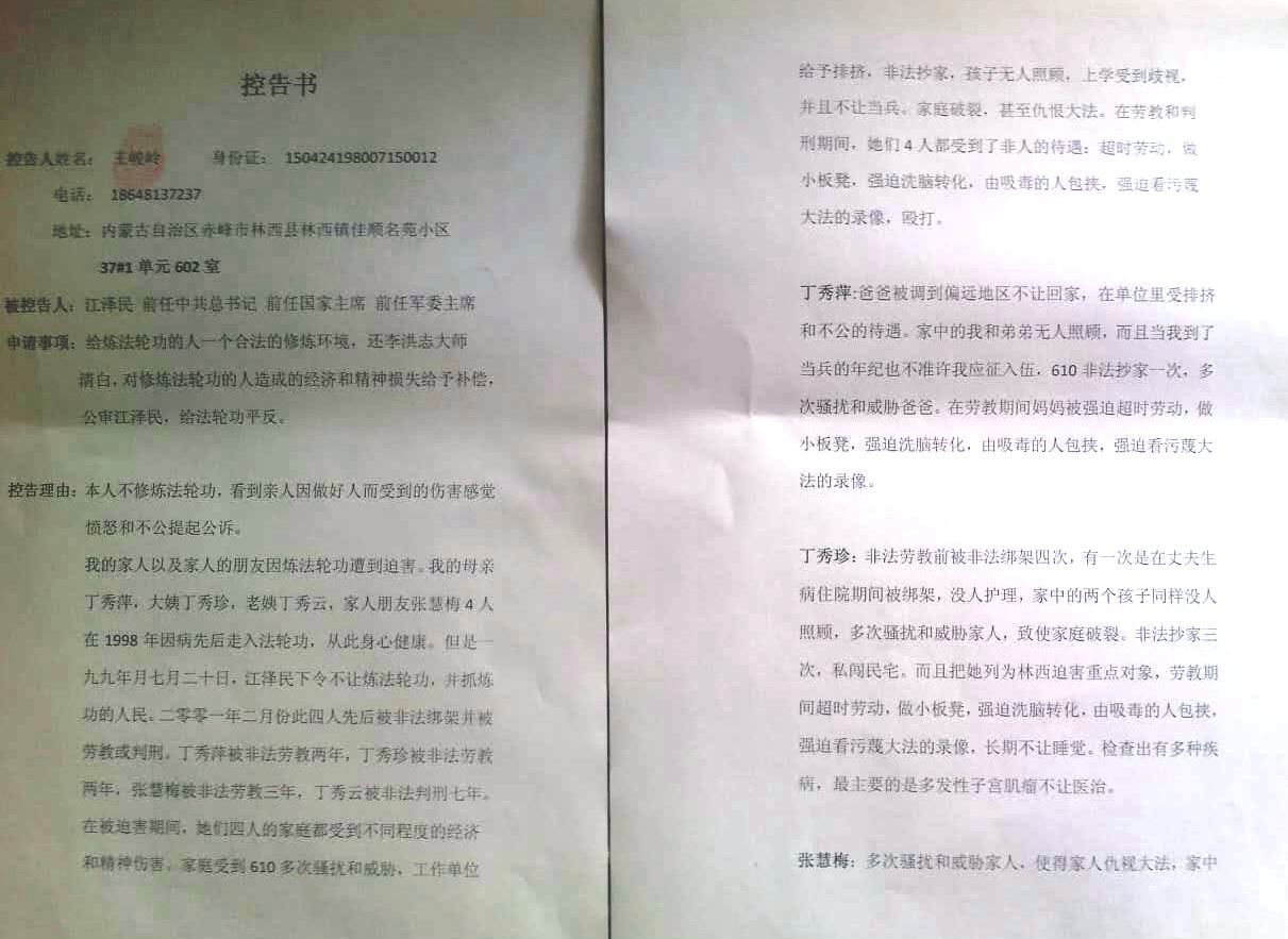 【明慧网二零一五年六月五日】(明慧网通讯员内蒙古报道)由于家人以及朋友因炼法轮功遭到迫害,赤峰市林西县王峻岭向最高检察院控告江泽民故意伤害罪、非法拘禁罪、非法搜查罪、剥夺公民信仰自由等罪,要求给炼法轮功的人一个合法的修炼环境,还李洪志师父清白,对修炼法轮功的人造成的经济和精神损失给予补偿。