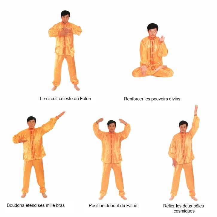 ![]() 图2:文章引用明慧网照片说:本图片展示了法轮功五套功法:佛展千手法、法轮桩法、贯通两极法、法轮周天法和神通加持法。 |