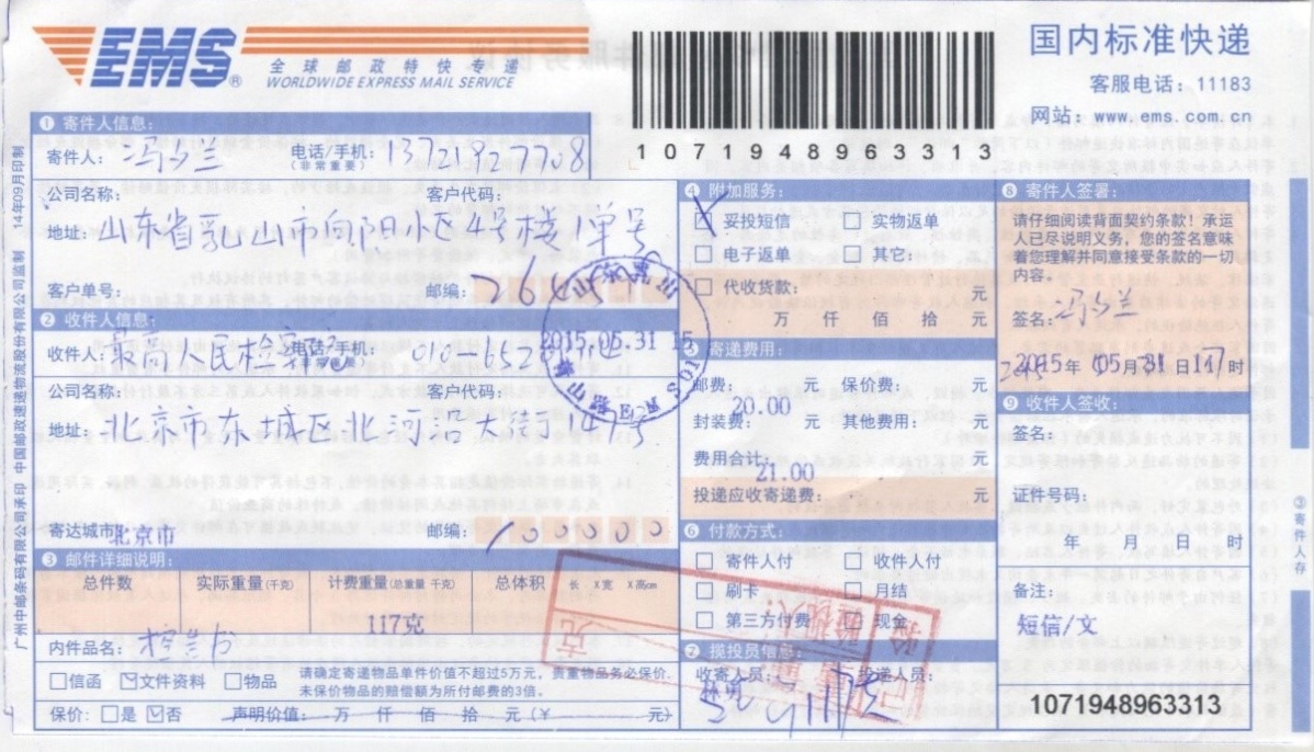 后来我被带到威海驻京办,在那里,我被铐在暖气管子上,在地下坐着。几天后,威海市环翠区北沟派出所警察李静和李波坐飞机去北京把我押回。在威海环翠区国保队,刘杰、刘金虎大声呵斥:蹲着。就你能耐,跑北京打横幅。后被非法关押在看守所。一月五日我被借给高区公安局顶任务,非法批我劳教三年。因身体原因没执行。
