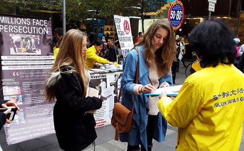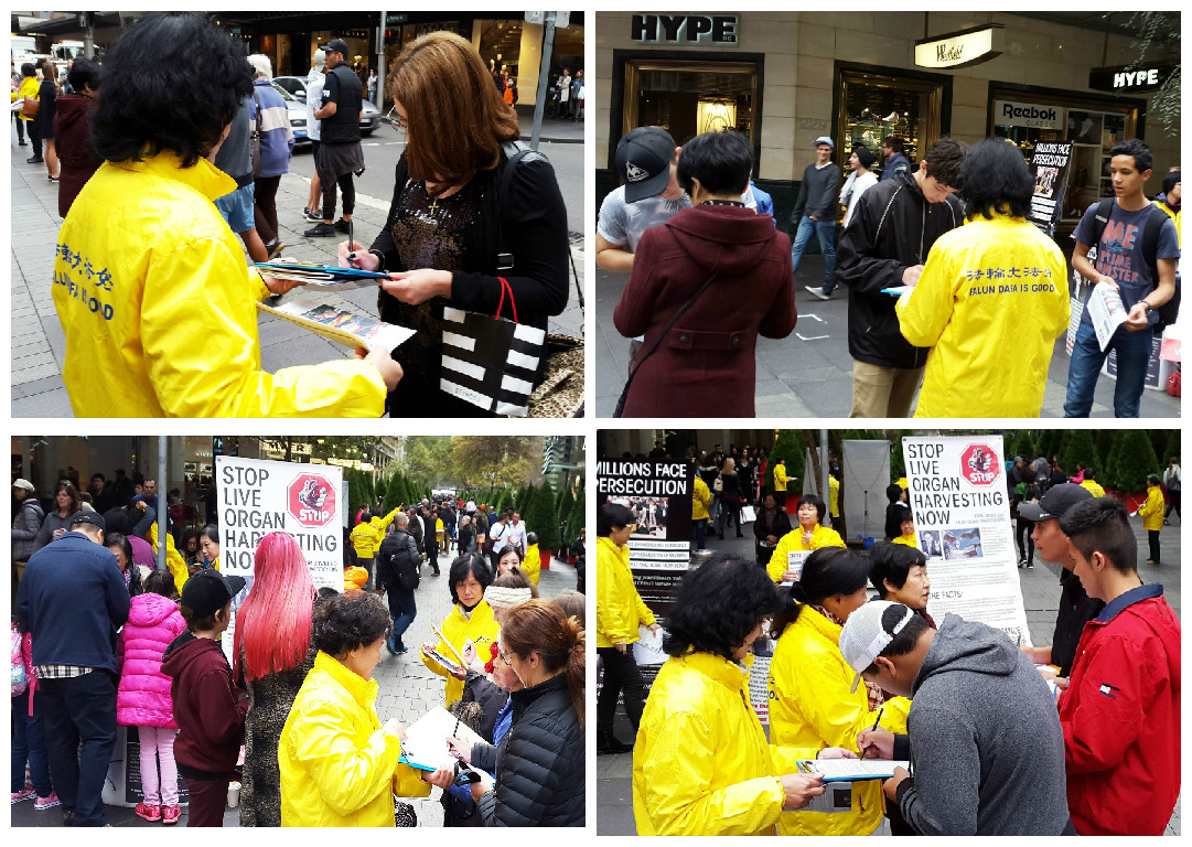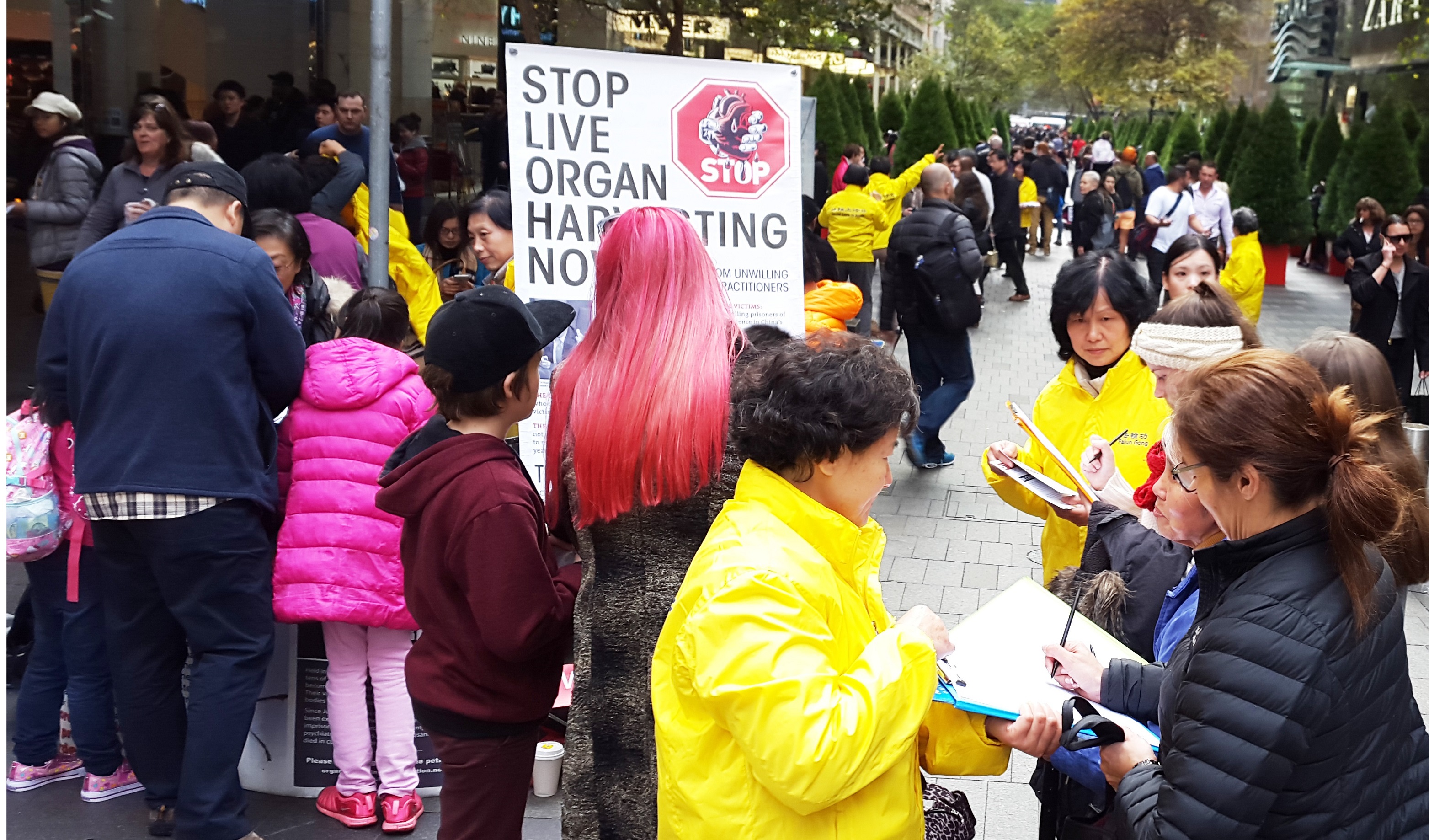 这个状况持续发生在悉尼最繁华商业主街皮特街(Pitt St)上,每周五下午澳洲主流社会各阶层的很多家庭或一群群的朋友,一个个挨着或等候着在那些身着黄衣服的法轮功学员面前签名支持反“活摘”。