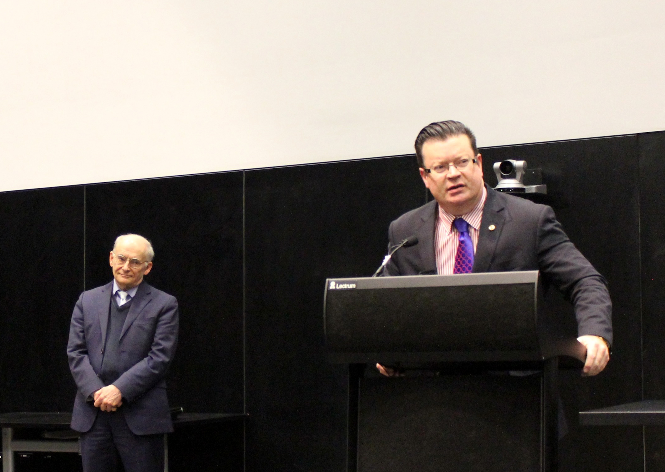 ![]() 维省自由党上议院议员伯尼菲恩(Bernie Finn MP)先生(右)在演讲中,左为麦塔斯先生。 |