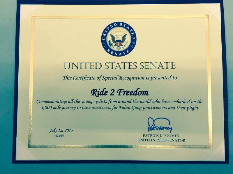 宾州联邦参议员帕特里克·图米(Patrick Toomey)在褒奖信中称赞少年骑手们为法轮功呼吁而付出的长途跋涉奔波及不懈努力。