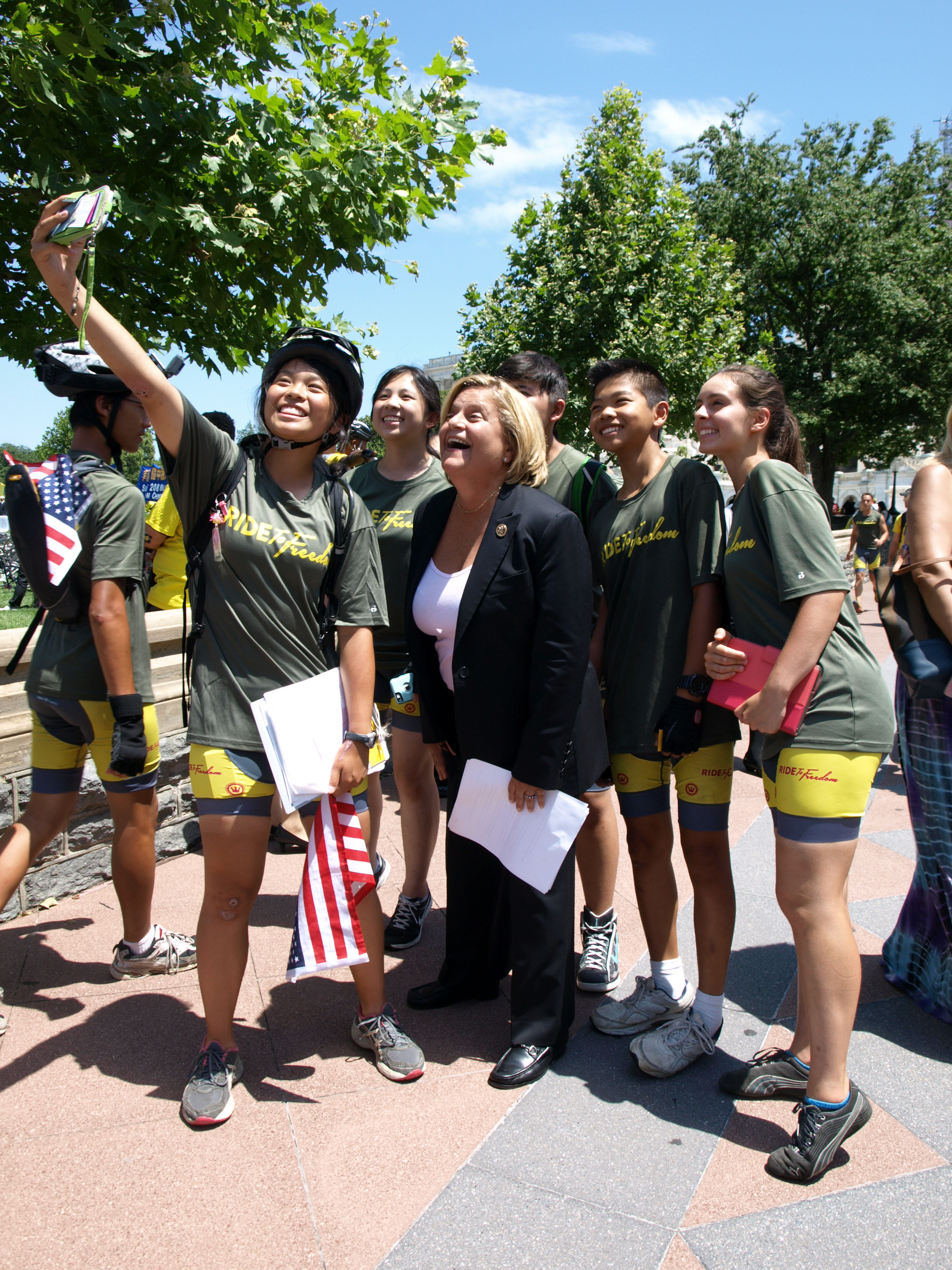 ![]() 二零一五年七月十六日,佛罗里达州国会众议员伊丽安娜·罗斯-雷婷恩(Ileana Ros-Lehtinen)与“骑向自由”的部分骑手们在美国国会山西草坪自拍合影。 |