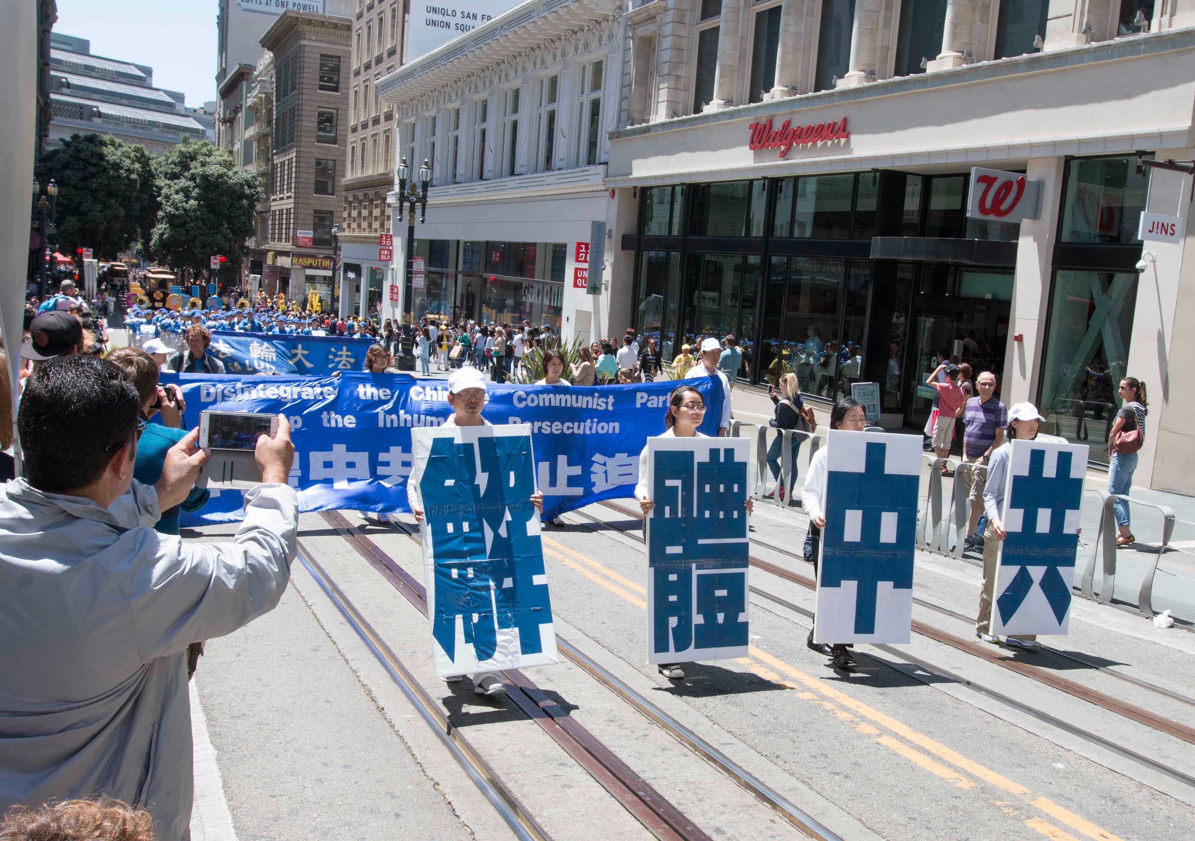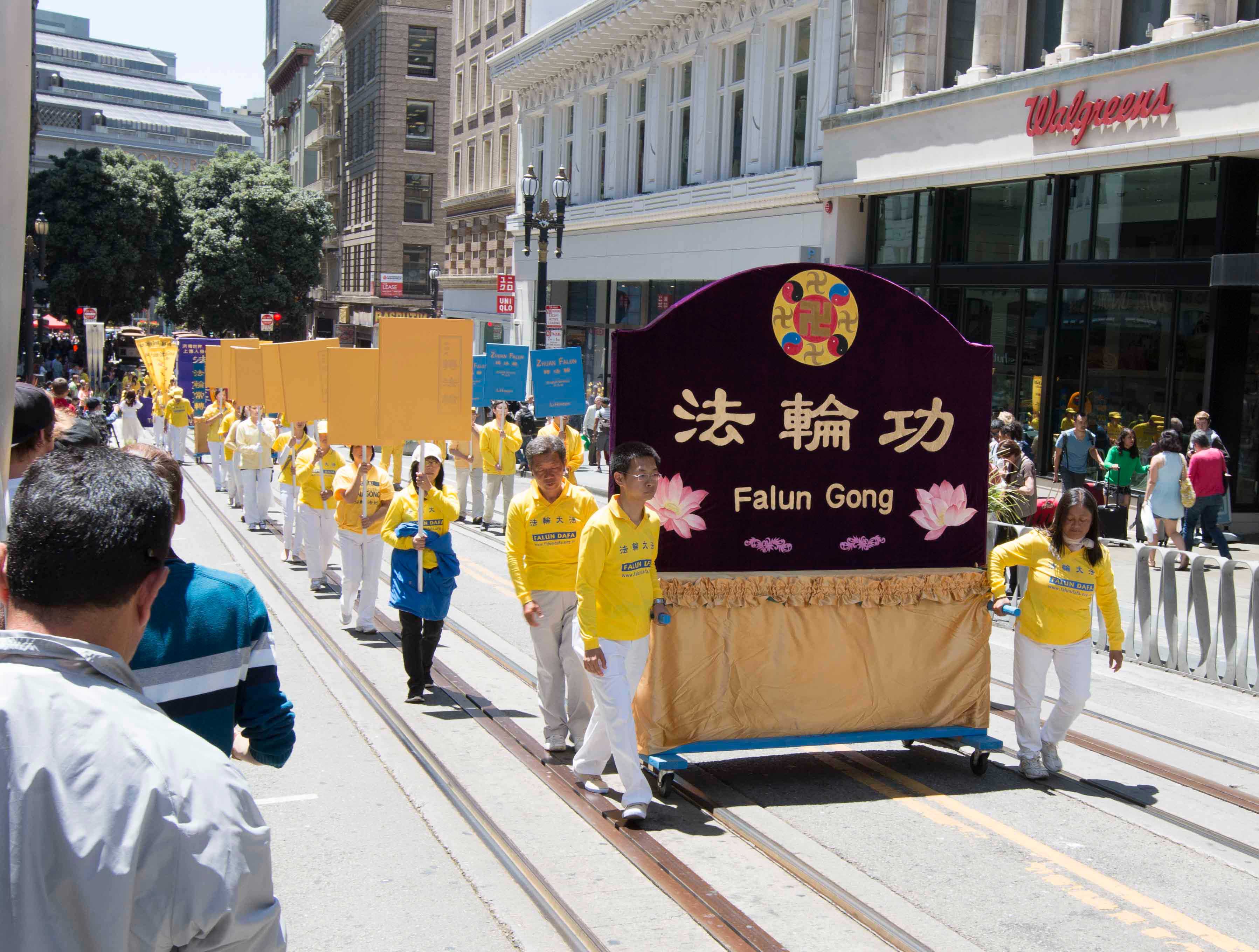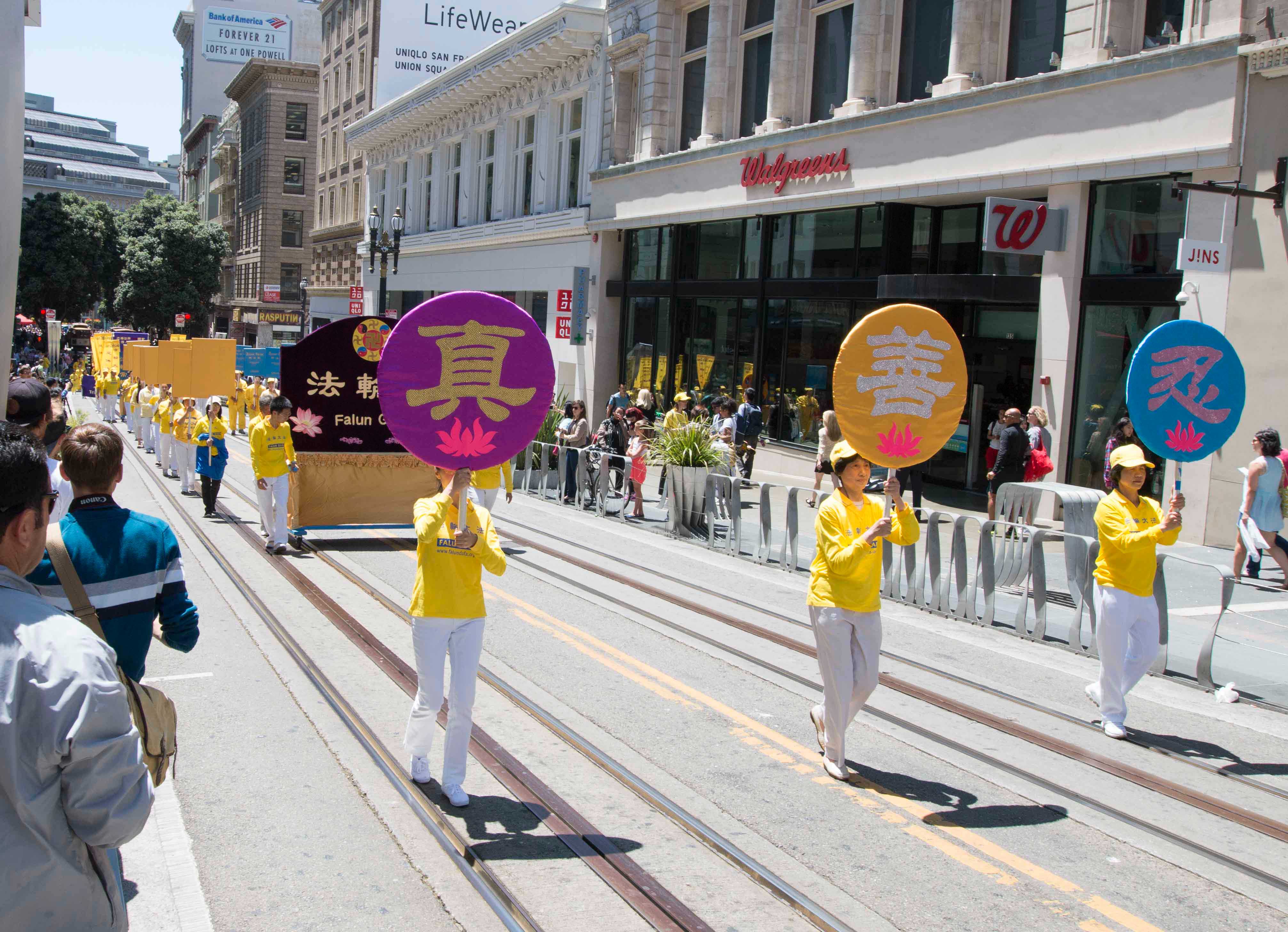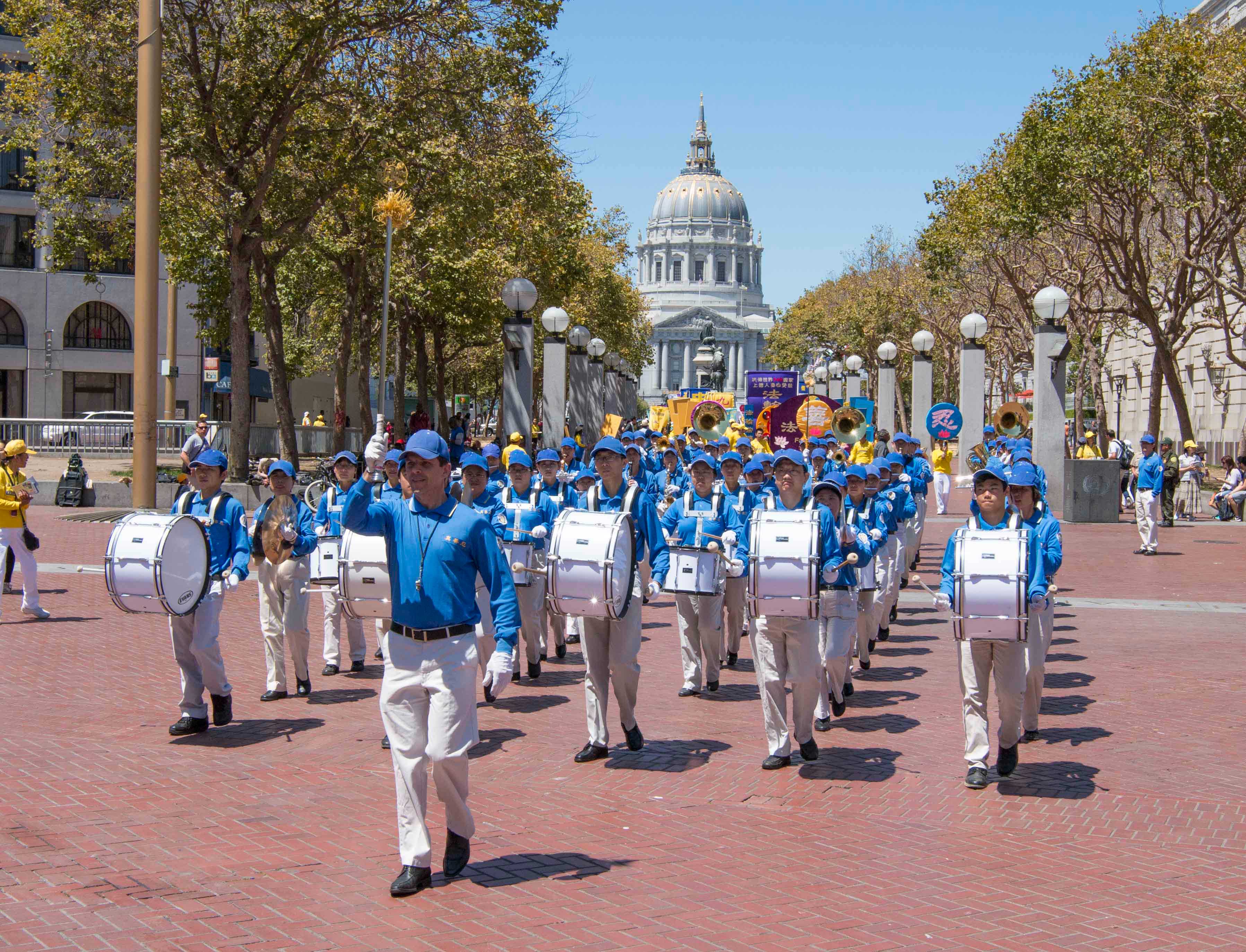 旧金山法轮功学员的游行队伍于中午十二点开始从位于市政厅附近的联合国广场出发,浩浩荡荡的游行队伍,在声势浩大的美西天国乐团的引领下沿着市场街经过主要市区,再环绕中国城,最后抵达中国城花园角广场举行集会。