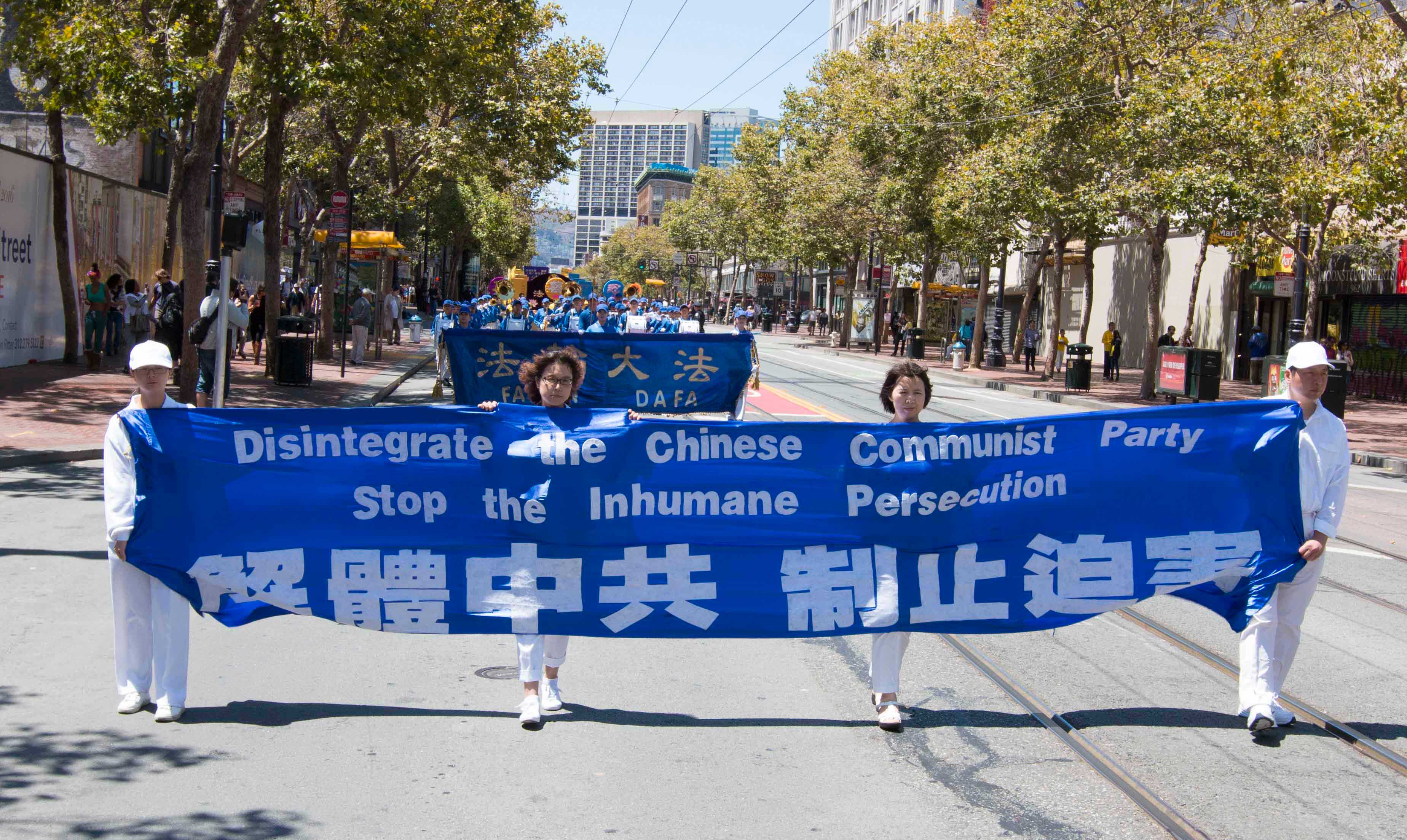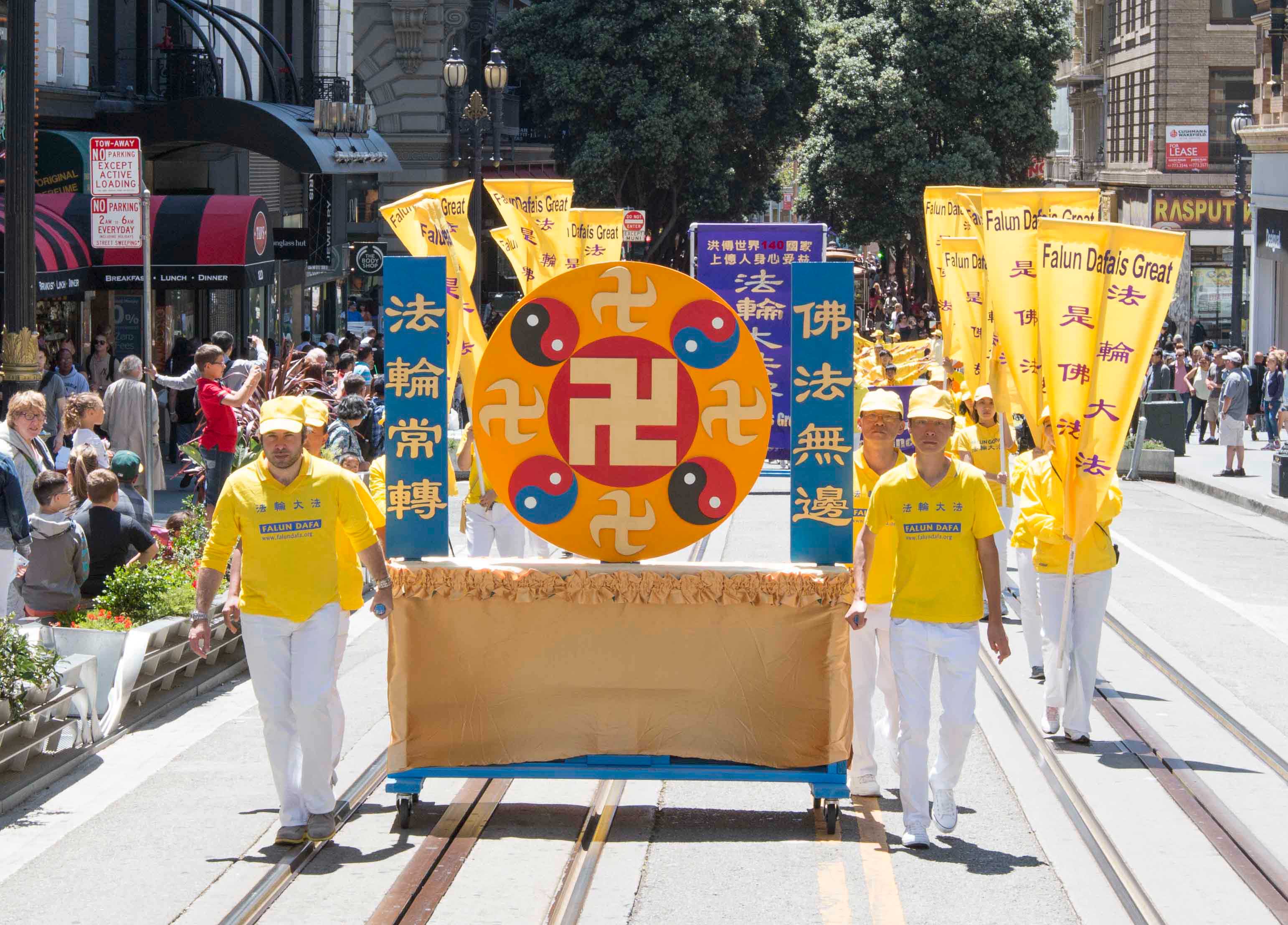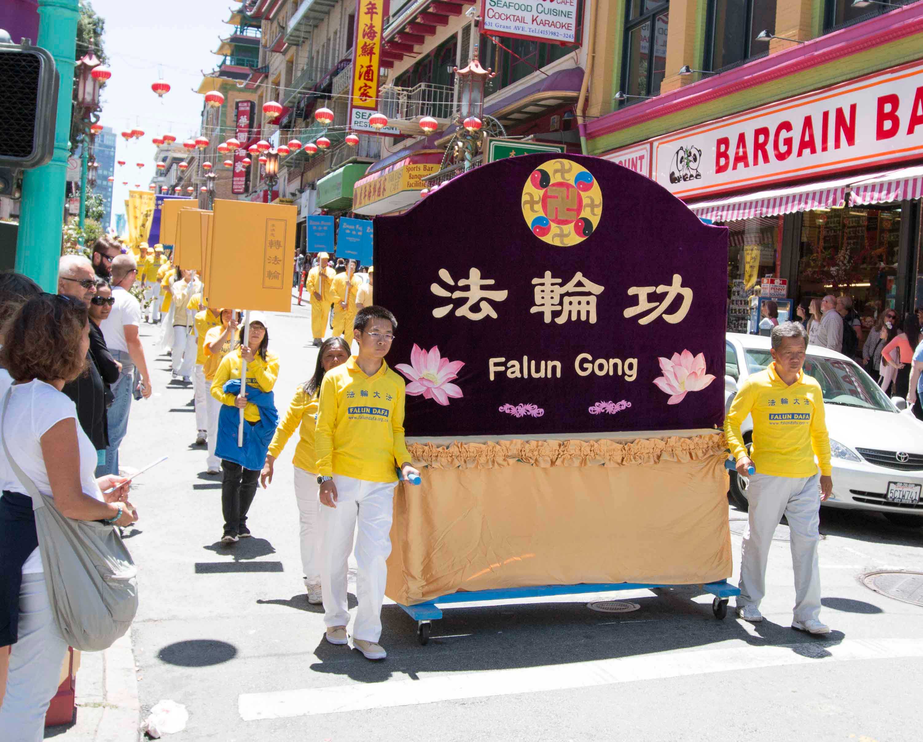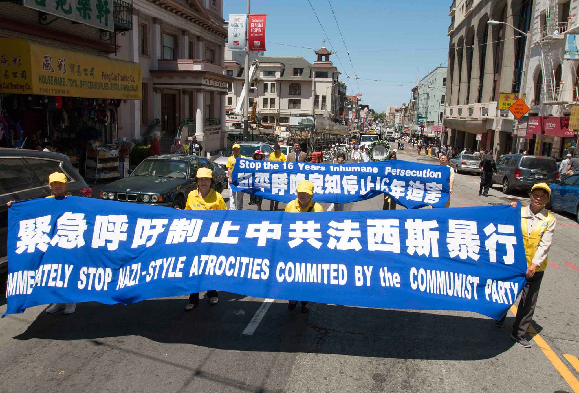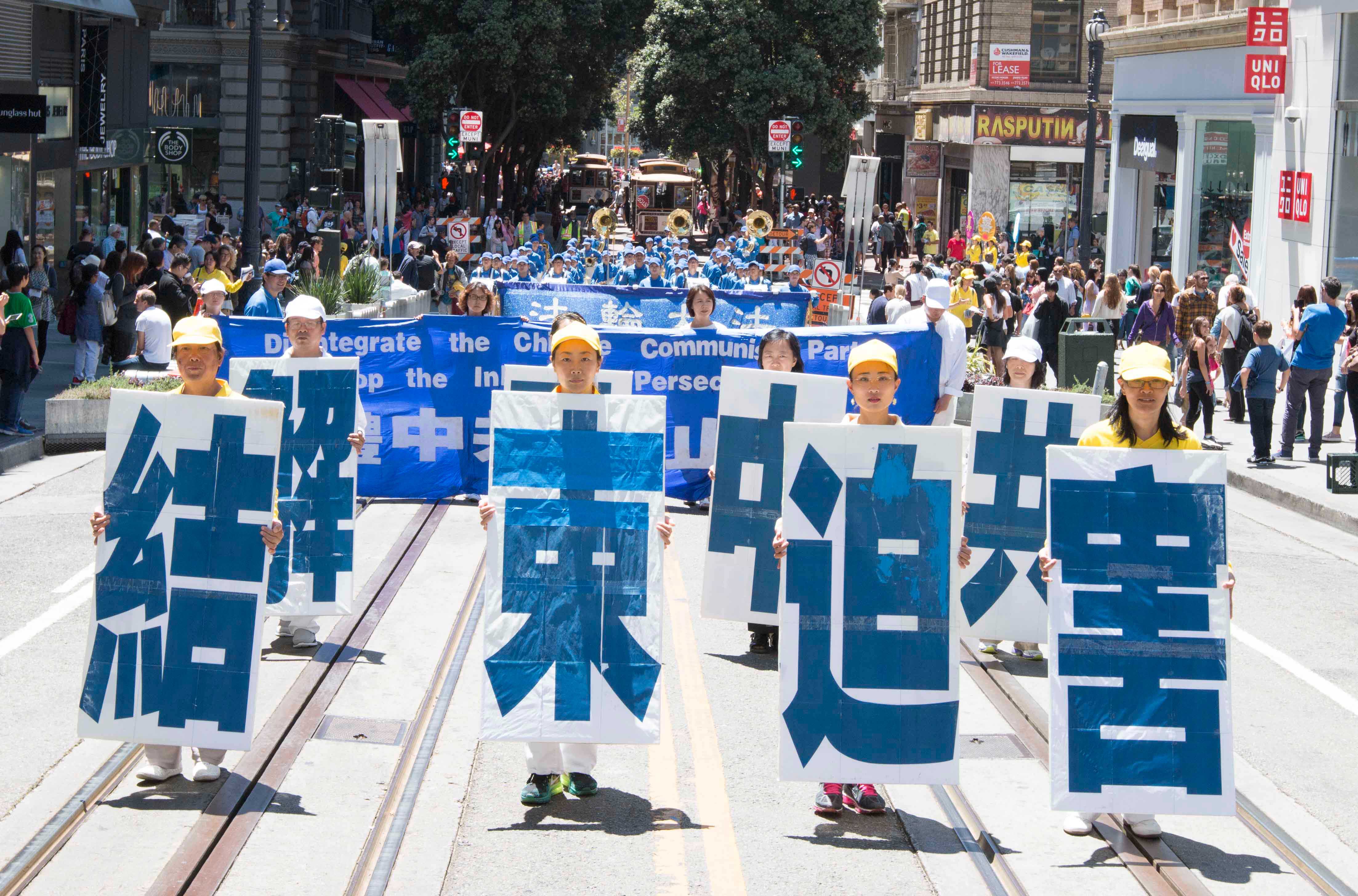 旧金山法轮功学员的游行队伍于中午十二点开始从位于市政厅附近的联合国广场出发,浩浩荡荡的游行队伍,在声势浩大的美西天国乐团的引领下沿着市场街经过主要市区,再环绕中国城,最后抵达中国城花园角广场举行集会。