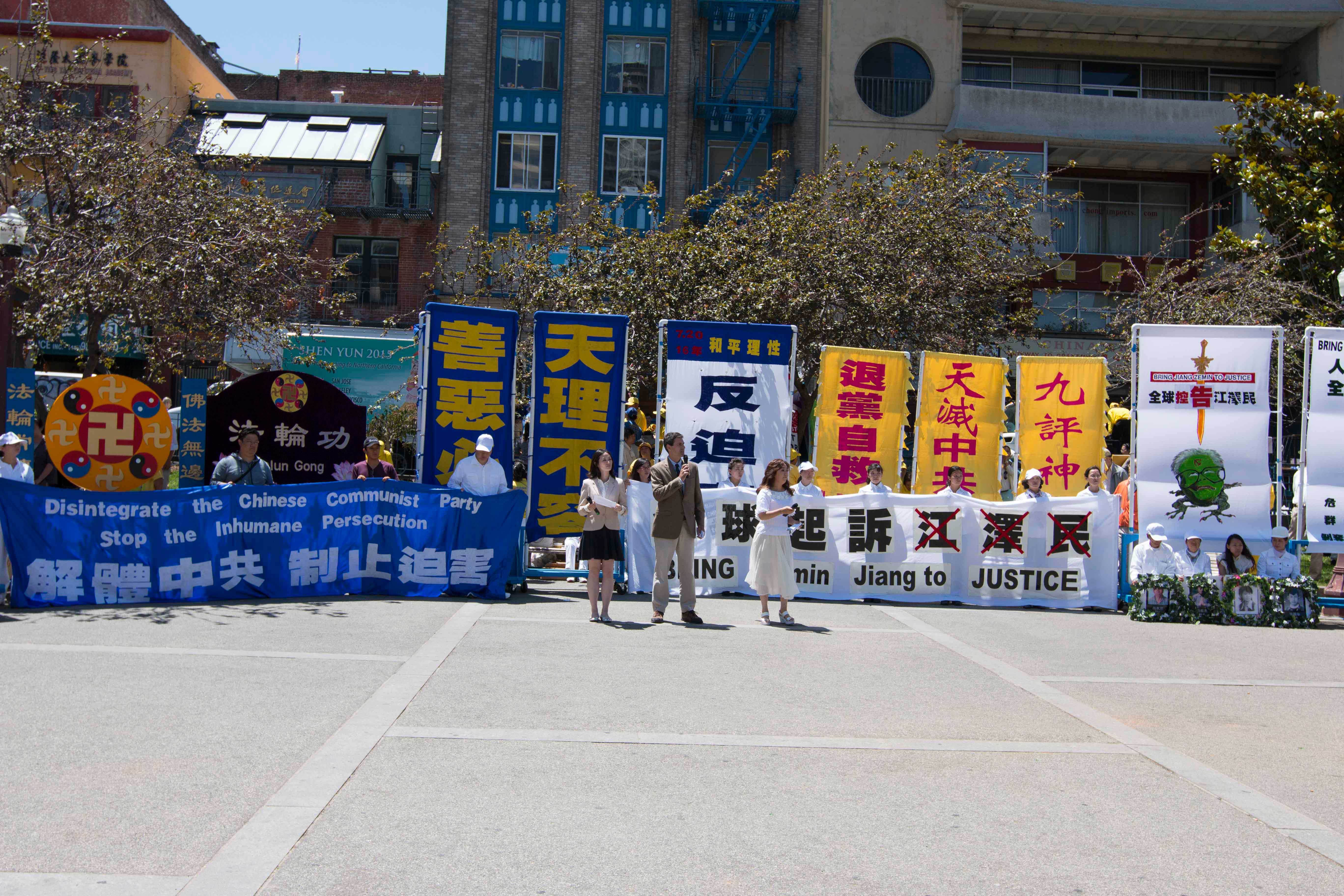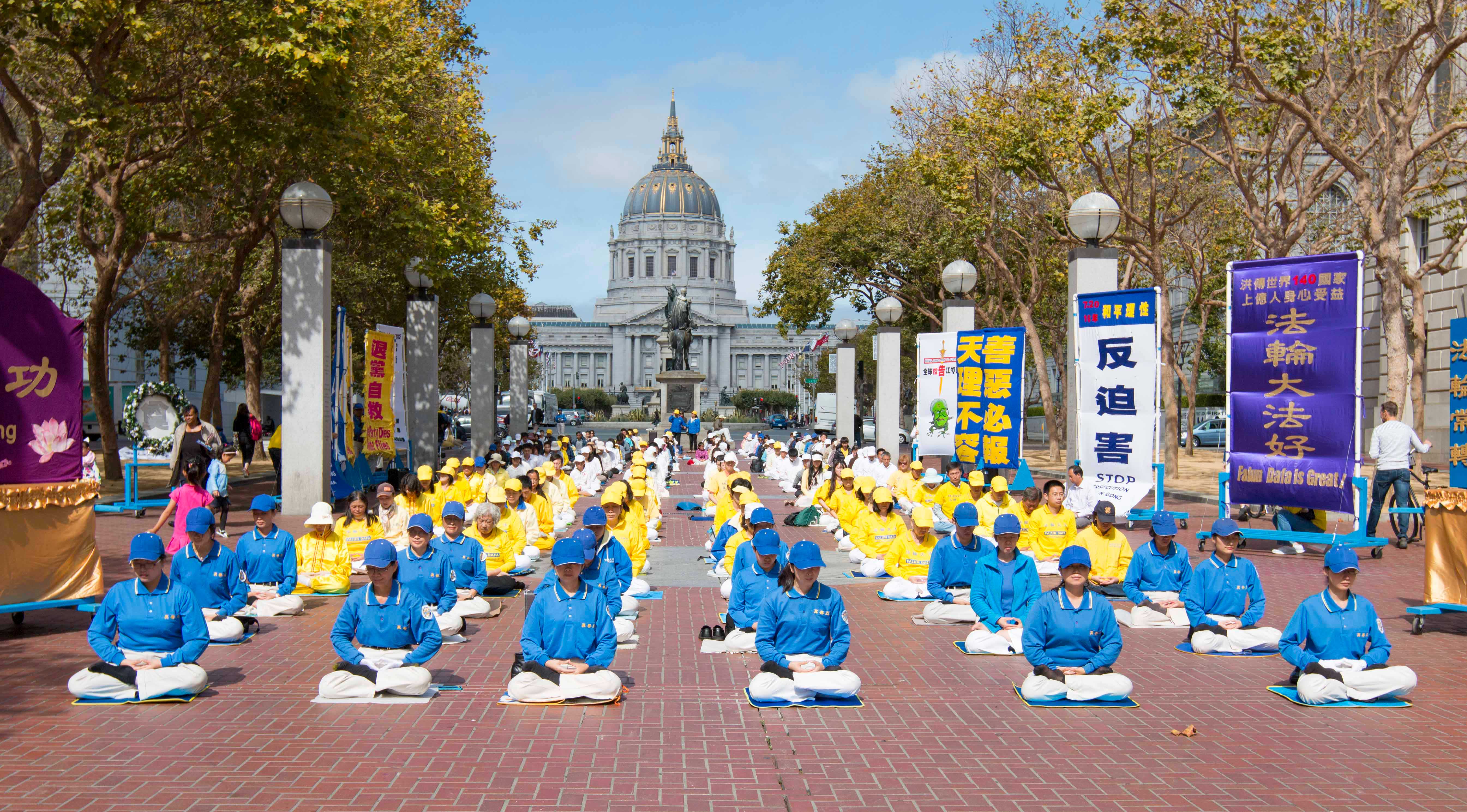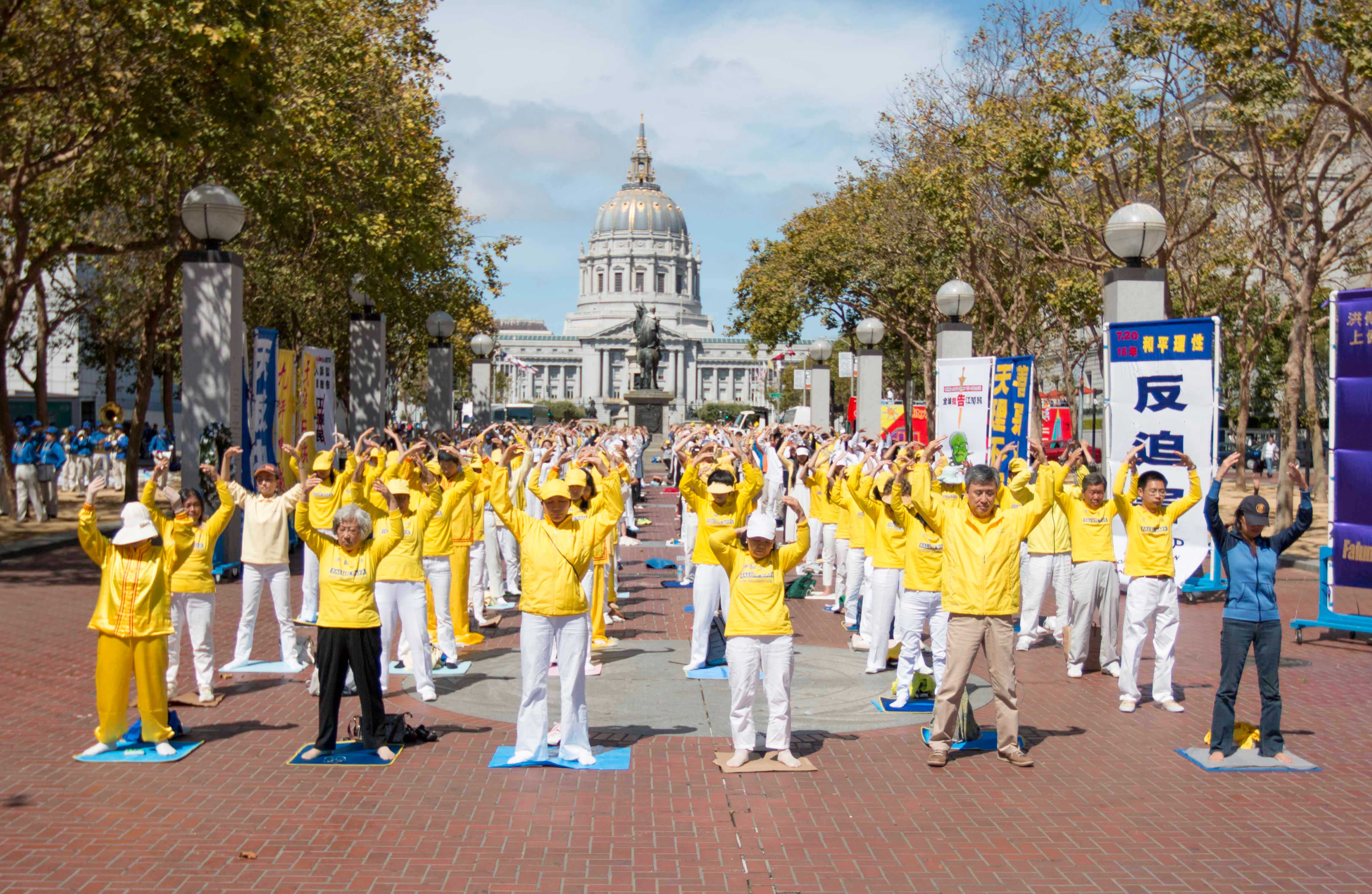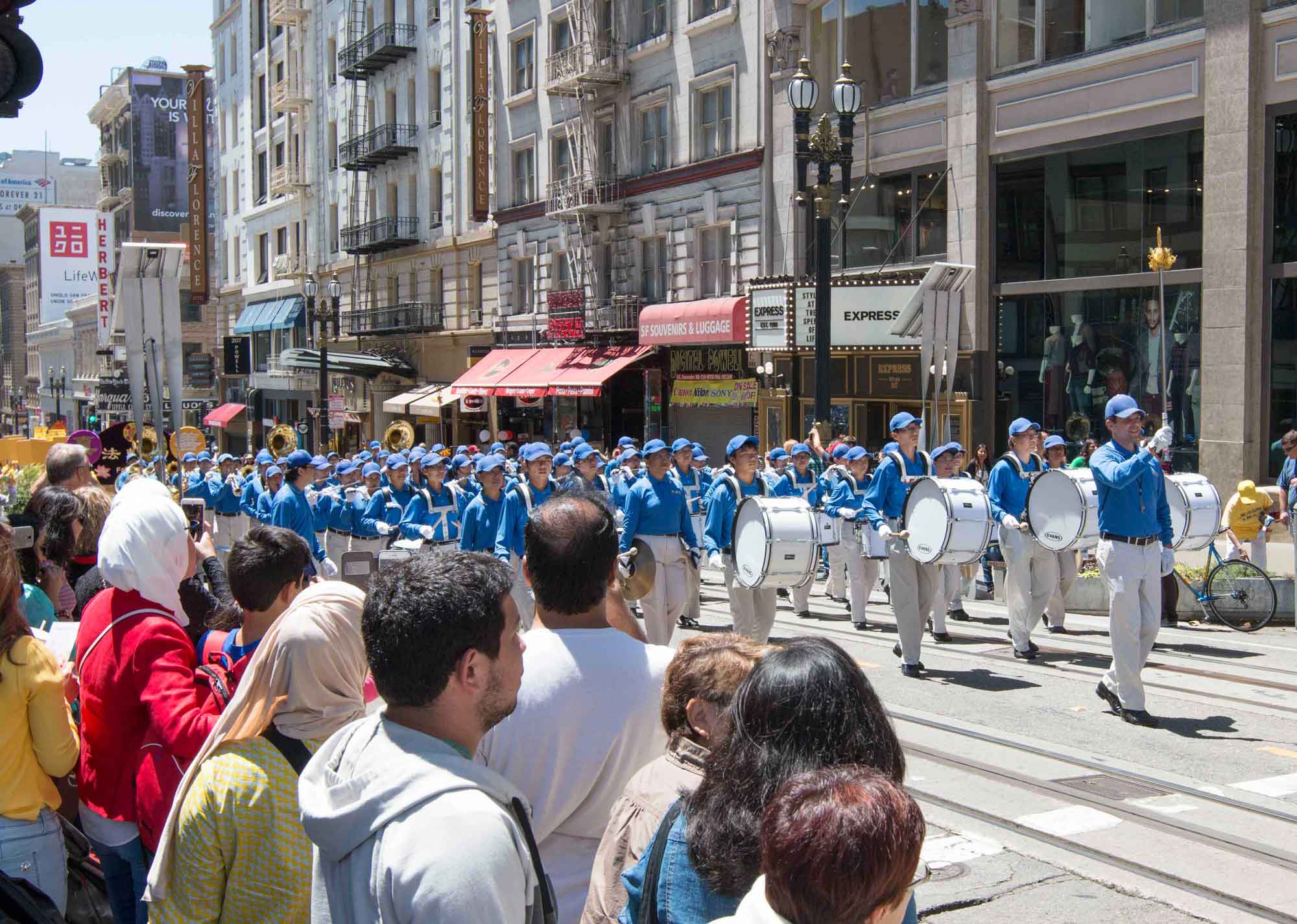 旧金山法轮功学员的游行队伍于中午十二点开始从位于市政厅附近的联合国广场出发,浩浩荡荡的游行队伍,在声势浩大的美西天国乐团的引领下沿着市场街经过主要市区,再环绕中国城,最后抵达中国城花园角广场举行集会。