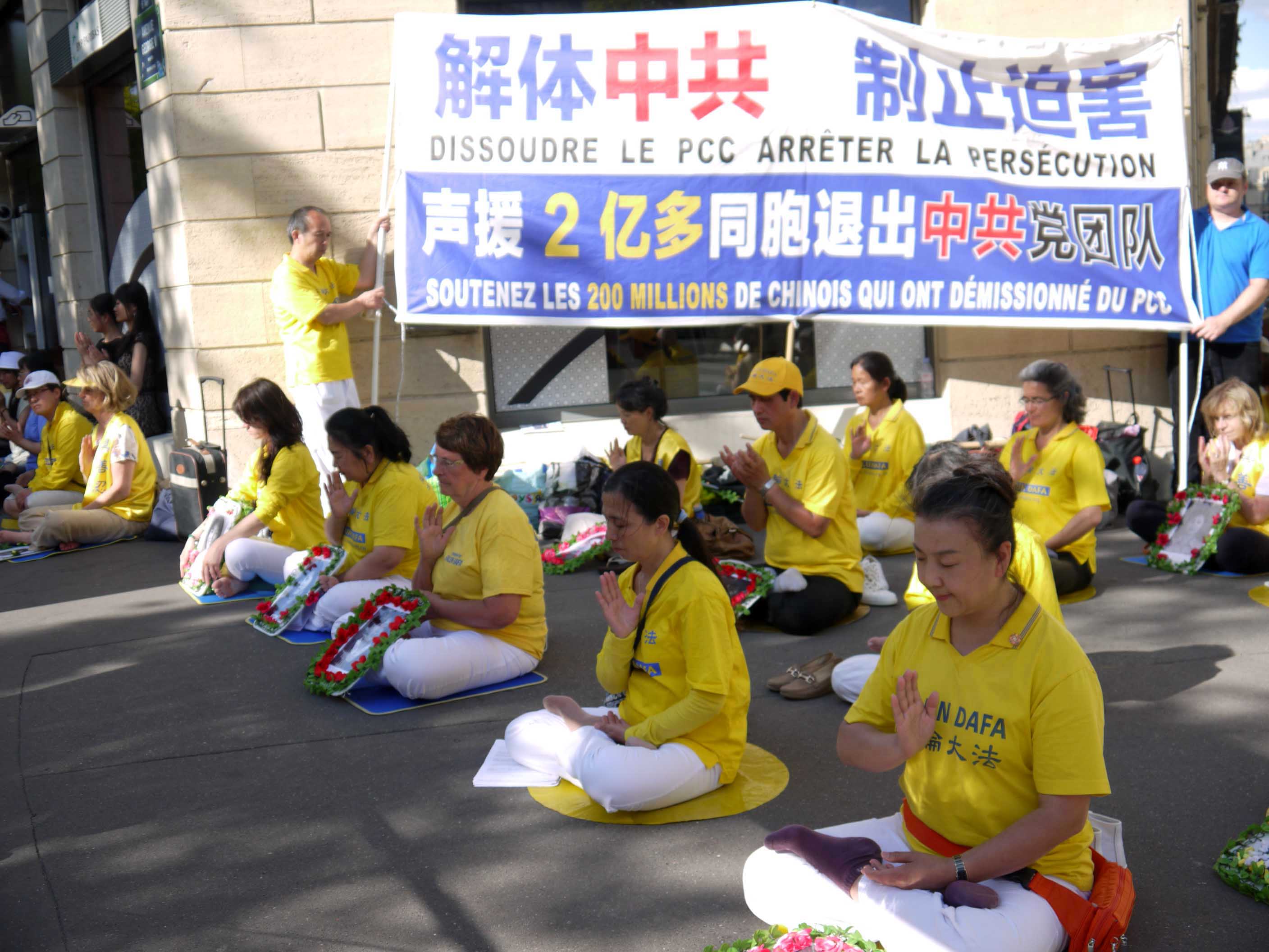 一位来自北京留学法国的小伙子一直在听在看集会。他是第一次看到这么多法轮功学员在一起集会,特别是这么大阵容的天国乐团,感到有很多的疑问,他说:“这和国内的宣传完全不一样。我和发资料的阿姨交谈,知道了一些有关法轮功在世界的一些情况,以及在国内被迫害致死很多人。“明白真相后,他以刘亮的化名退出少先队。