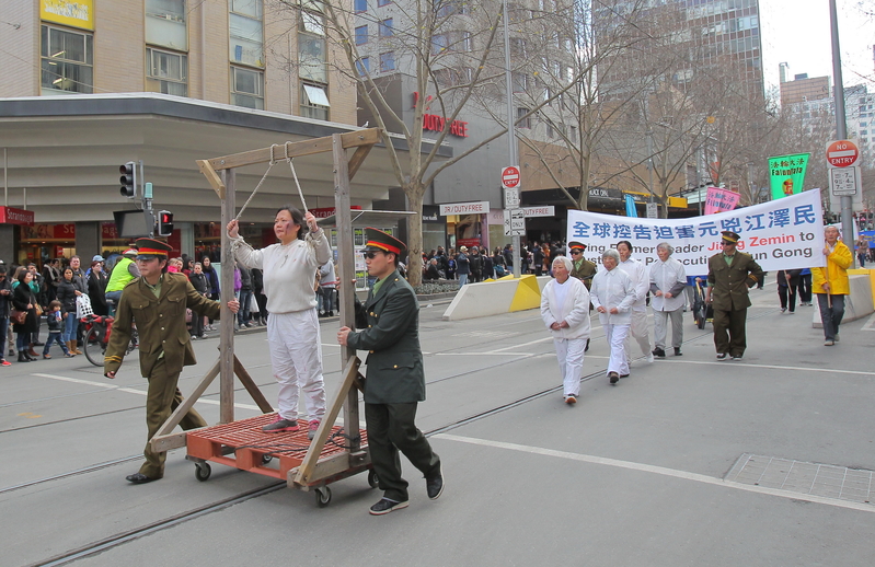 “血腥的活摘器官”方队通过真人模拟,向公众展示了中国大陆法轮功学员正在遭受的酷刑迫害。在过去十六年里,江氏集团对法轮功学员实施“名誉上搞臭、经济上搞垮、肉体上消灭”、“打死算白死”等迫害政策,法轮功学员因坚持“真、善、忍”信仰遭受到毒打、电刑、强奸、强迫注射破坏中枢神经药物等上百种酷刑的折磨。江泽民集团对法轮功学员的迫害手段集古今邪恶之大全,甚至大量活体摘取法轮功学员器官,这是人类历史上从未出现过的邪恶迫害。