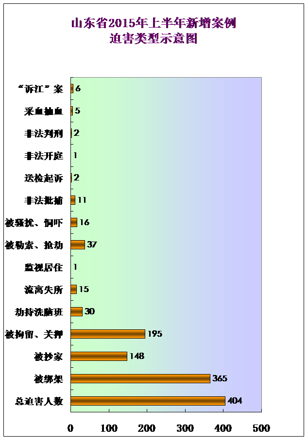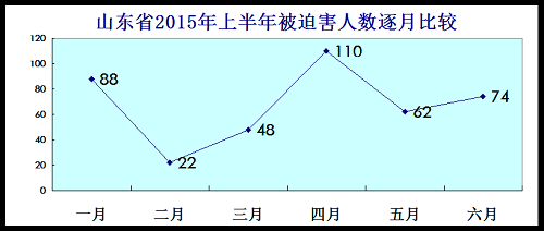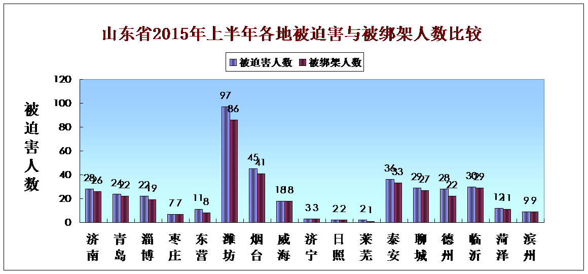 山东省2015年上半年有404人被迫害,其中被绑架的达365人,占90%以上。最严重地区有潍坊、烟台、泰安、临沂,潍坊尤甚,有86人被绑架,占全省的23.5%,在全国也是名列前茅,臭名昭著。