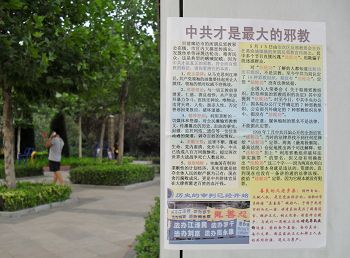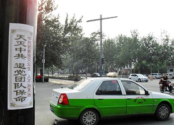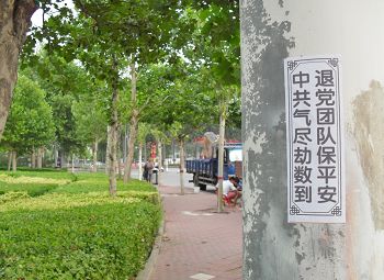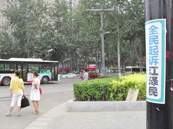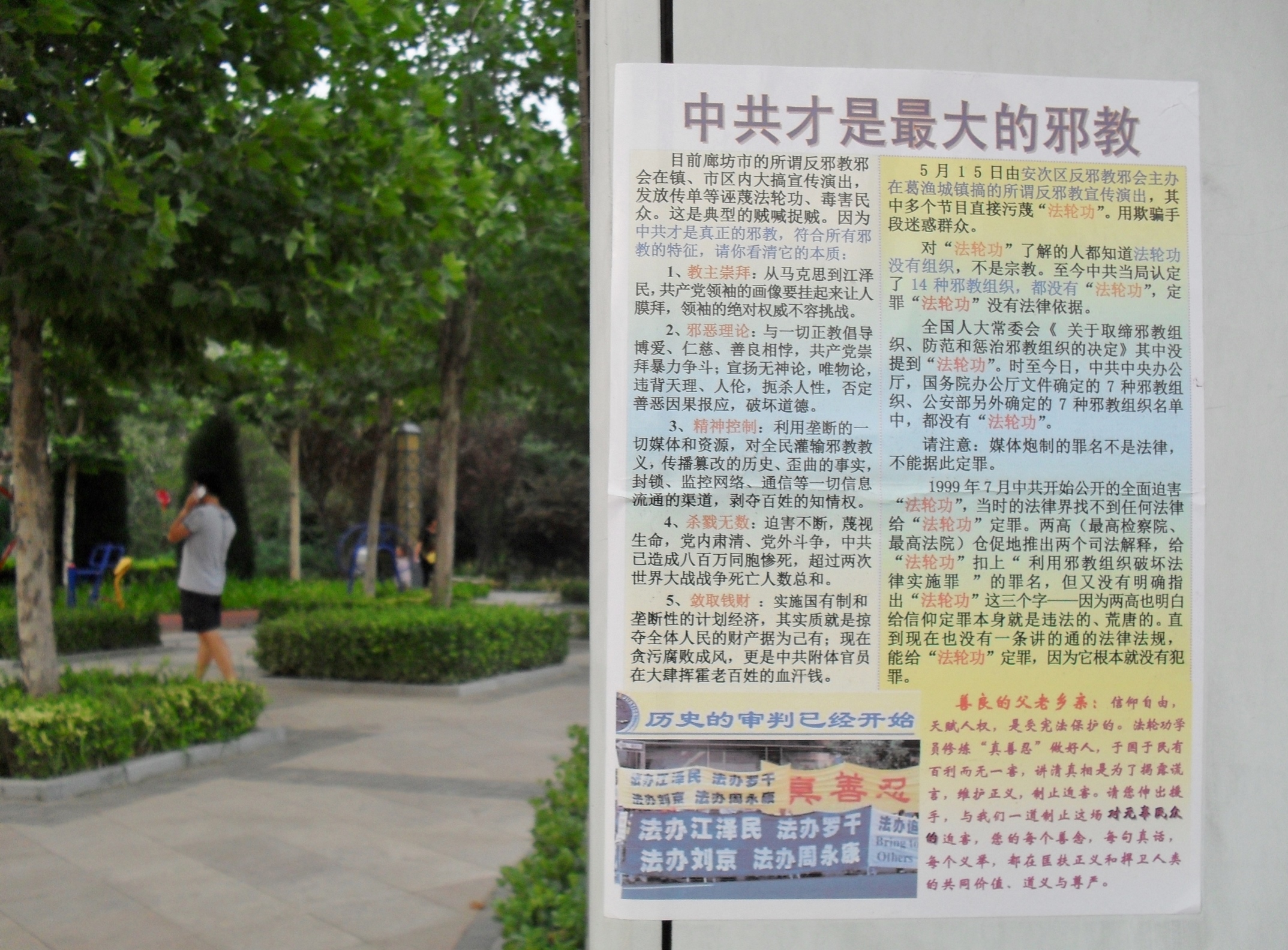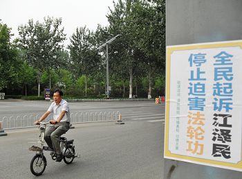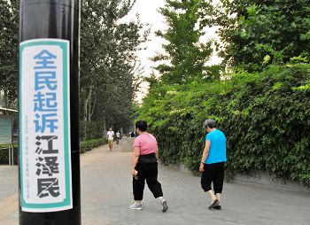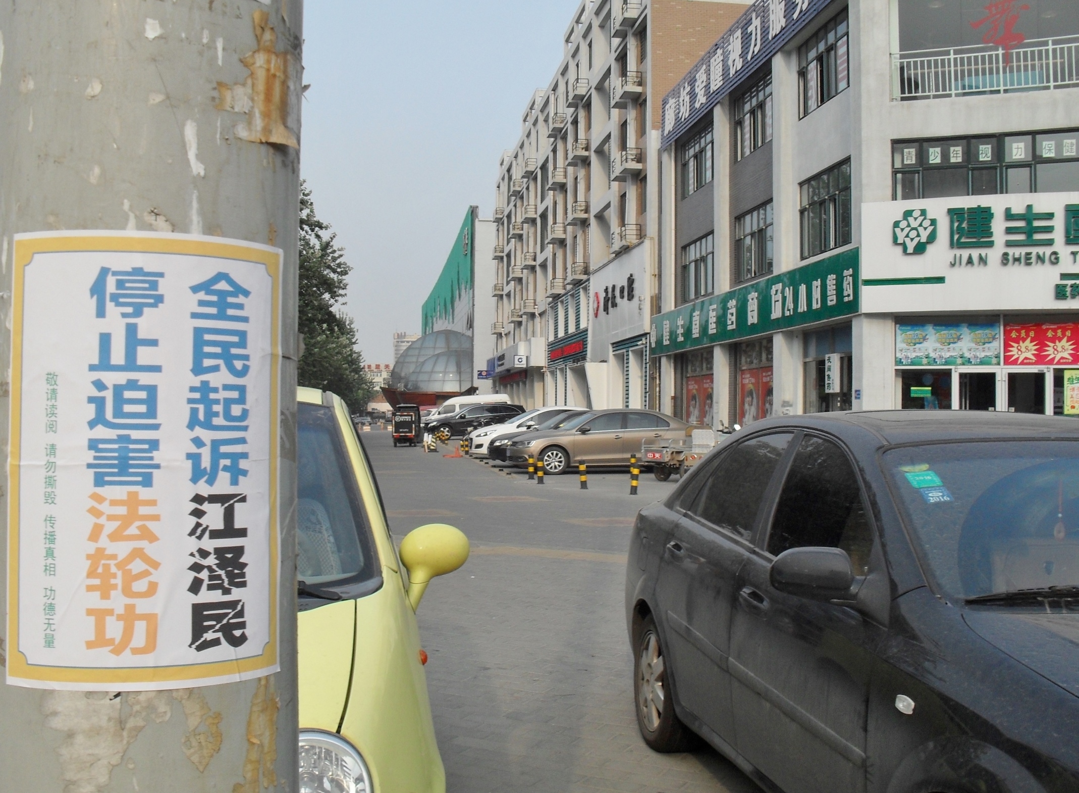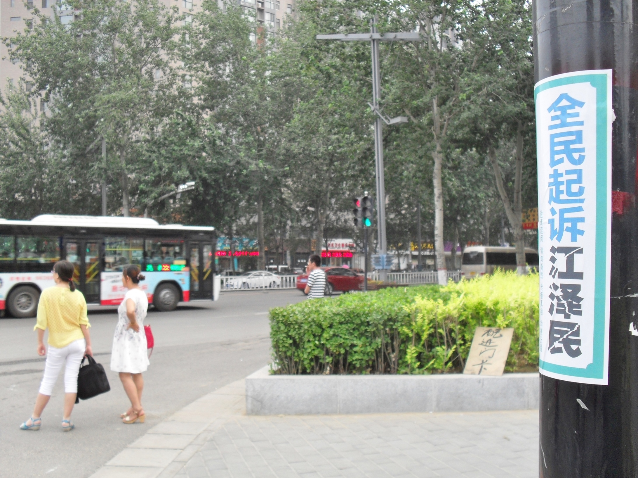 法轮功,把江泽民送上法庭”、“全民起诉江泽民”、“天灭中共,退党保平安”、“起诉江泽民,还人间正道“等。