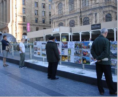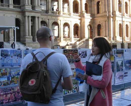 七月十八日这天是星期六,布里斯本广场人流如梭,很多人驻足观看展板,向学员了解真相。