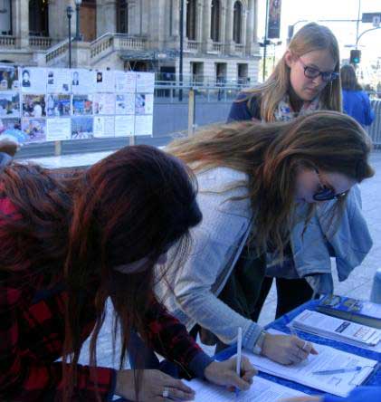 当天,在从上午十点至下午四点的活动期间,很多人在反活摘器官罪行的征签簿上签名,表达他们对法轮功的支持,谴责中共大规模活摘法轮功学员器官的暴行。