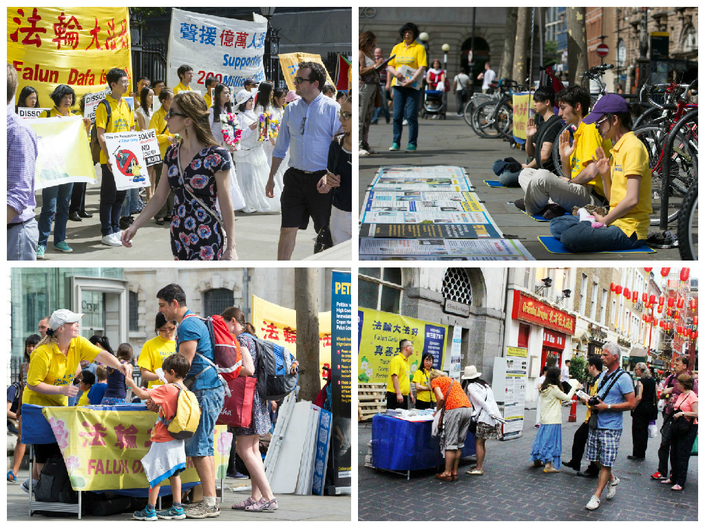 当天下午,英国法轮功学员同时在首相府对面、伦敦中国城、和圣马丁广场三个地点进行了讲真相的活动。在伦敦这个游客众多的国际大都市,受到很多来自世界各地的民众的支持,人们纷纷前来了解真相,并极力谴责中共江泽民集团对法轮功学员的骇人听闻的迫害。