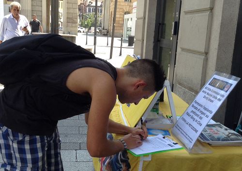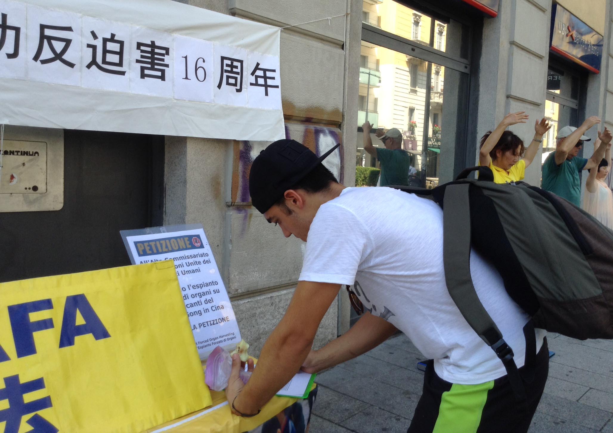 二零一五年七月二十日一大早,意大利学员在米兰中领馆对面的街道刚刚挂上“中共是迫害法轮功的元凶”,“法办江泽民、罗干、刘京、周永康”等横幅和真相展板,就有一位外国游客过来对着横幅和展板拍照,一边拍一边向我们微笑示意,临走时,还做手势,表示“(你们)做的好!”