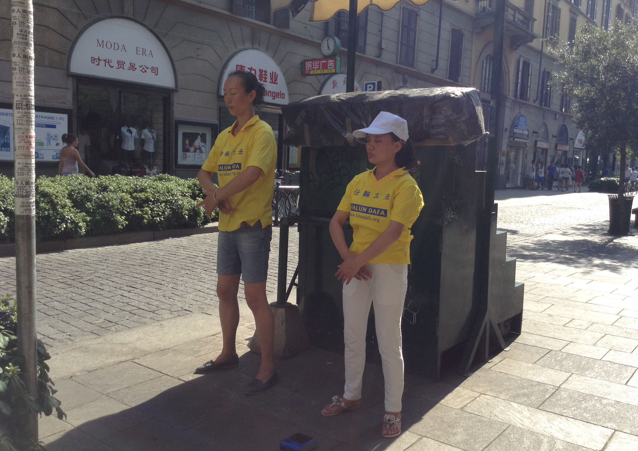 ![]() 图1:二零一五年七月二十日,意大利学员在米兰中领馆前炼功,纪念七.二零法轮功反迫害十六周年,声援两亿中国勇士退出中共,以及声援八万人控告迫害元凶江泽民。 |
