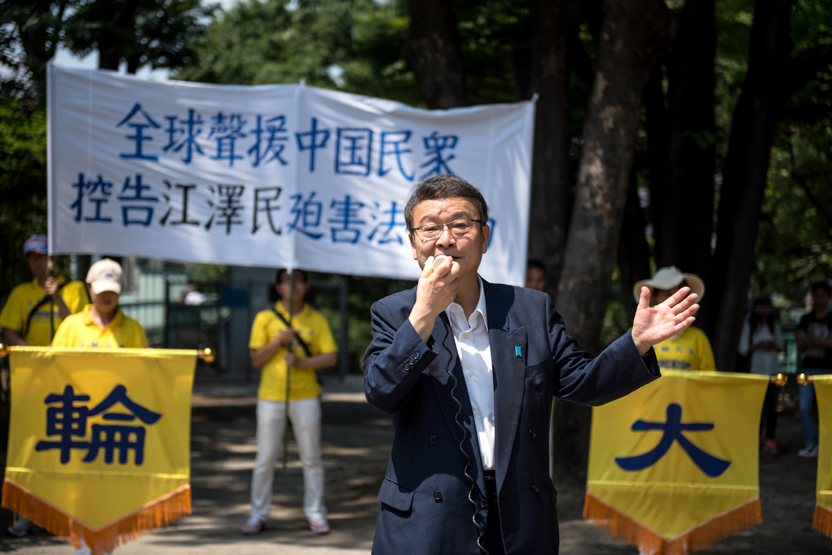 ![]() 图2:东京都议员古贺俊昭在集会上发言表示,支持法轮功学员坚持信仰自由,坚持正义。 |