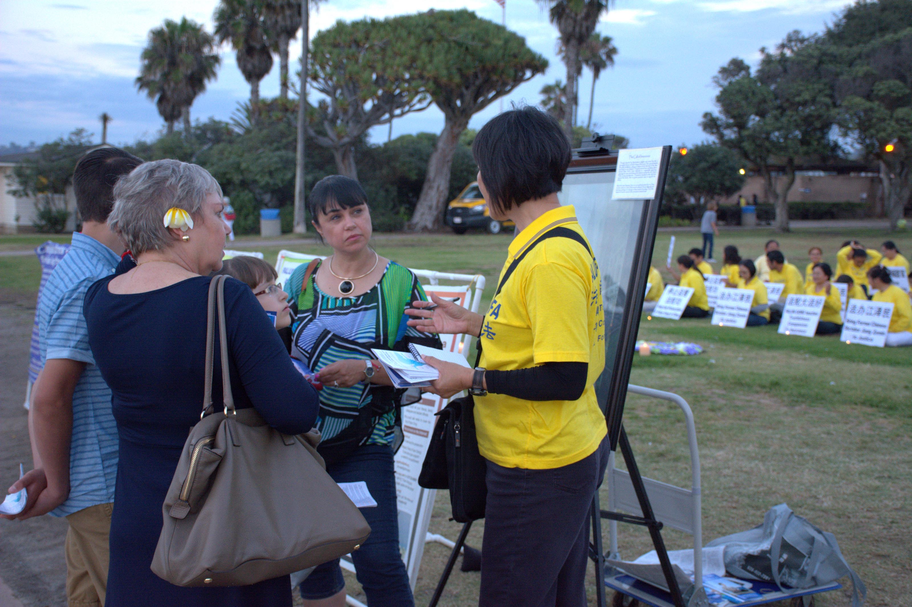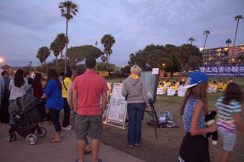 很多游人被集会和烛光悼念的场面感动,纷纷了解真相,并在制止活摘法轮功学员器官的征签簿上签名。很多人表示,中共压抑信仰自由、迫害平和的法轮功修炼人,甚至活摘他们的器官牟取暴利,令人发指。到拉荷亚海滩遛弯的一对居住在圣地亚哥的中国老年夫妇说,我们都知道法轮功都是好人,共产党做的坏事太多了,我们都知道。