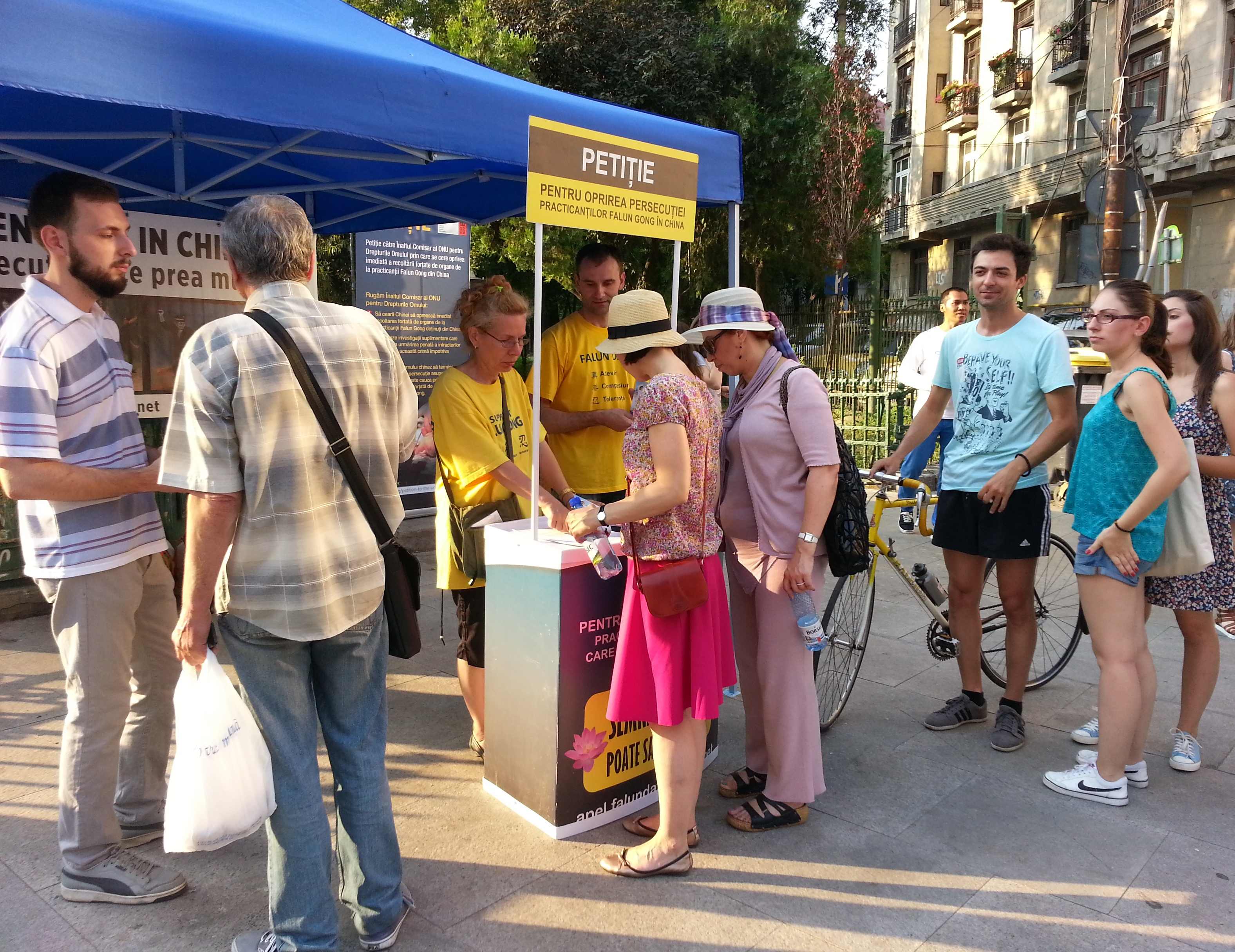一九九九年的七月二十日,江泽民集团动用所有国家机器在中国对法轮功群体发动全面残酷的打压和迫害、并煽动民众仇恨法轮功。面对中共的暴行,罗马尼亚法轮功学员没有退却,十六年来大家坚持秉承“真善忍”精神,把法轮功的真相传播到罗马尼亚的每一个角落。大家自 己出钱做了真相展板、条幅、传单、真相光碟等,并每年多次到罗马尼亚各个城市举办“真善忍美展”和弘法活动。十几年来,法轮功学员每周在布加勒斯特市的Herăstrău公园的湖边坚持炼功弘法,即使遇到风霜雨雪天气,也从未间断。在大家的努力下,很多罗马尼亚民众都明白了中共残酷迫害法轮功的真相,也吸引了更多的人前来学功。