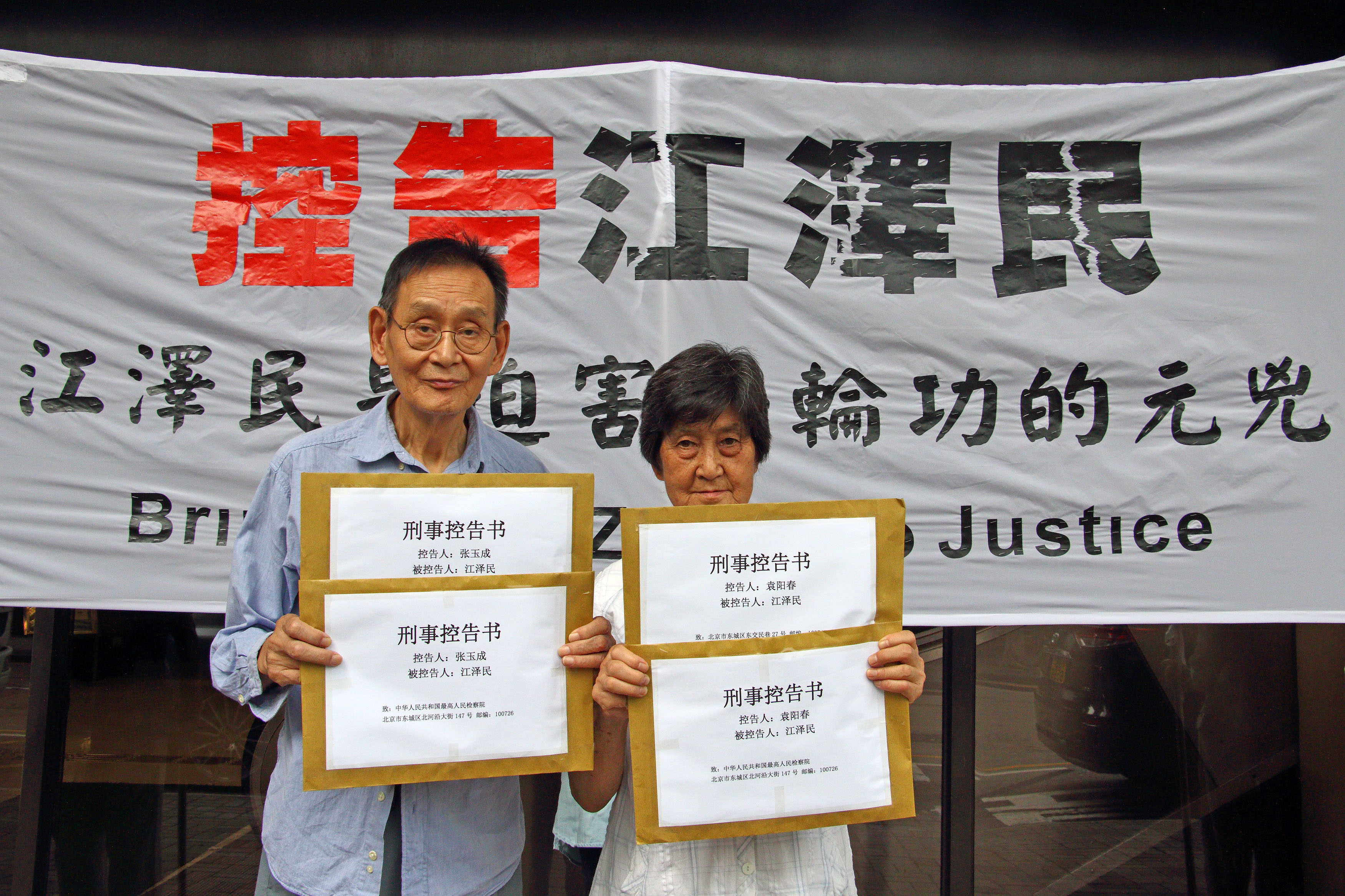 ![]() 图4. 七十五岁的袁阳春(右)与丈夫张玉成(左)一起控告江泽民,要将他的罪行曝光于天下。 |