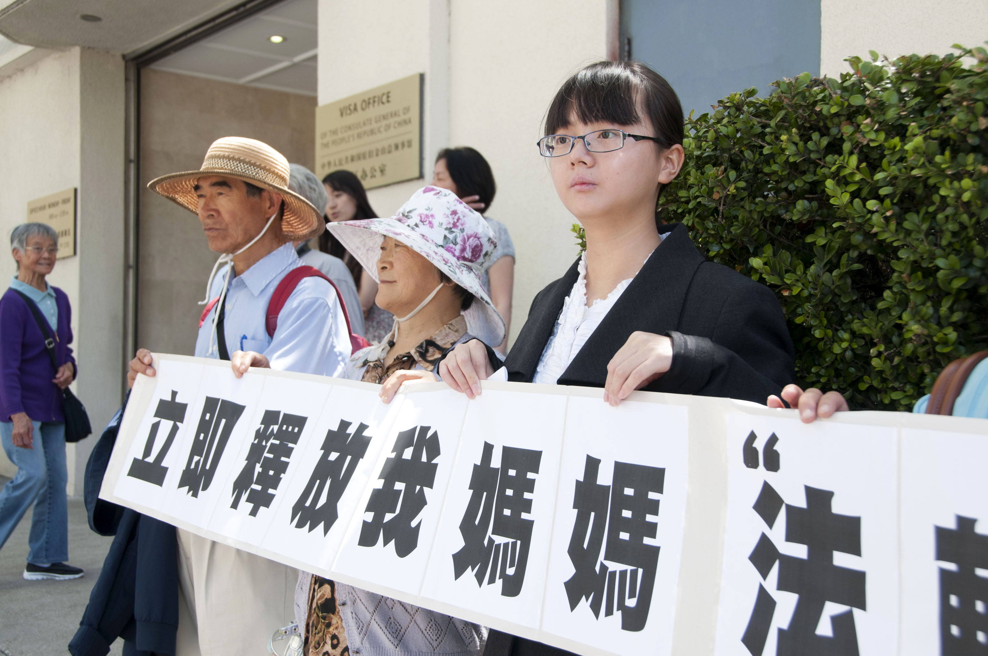 旧金山州立大学学生林煜(右一) 要求中共当局立即释放她的母亲