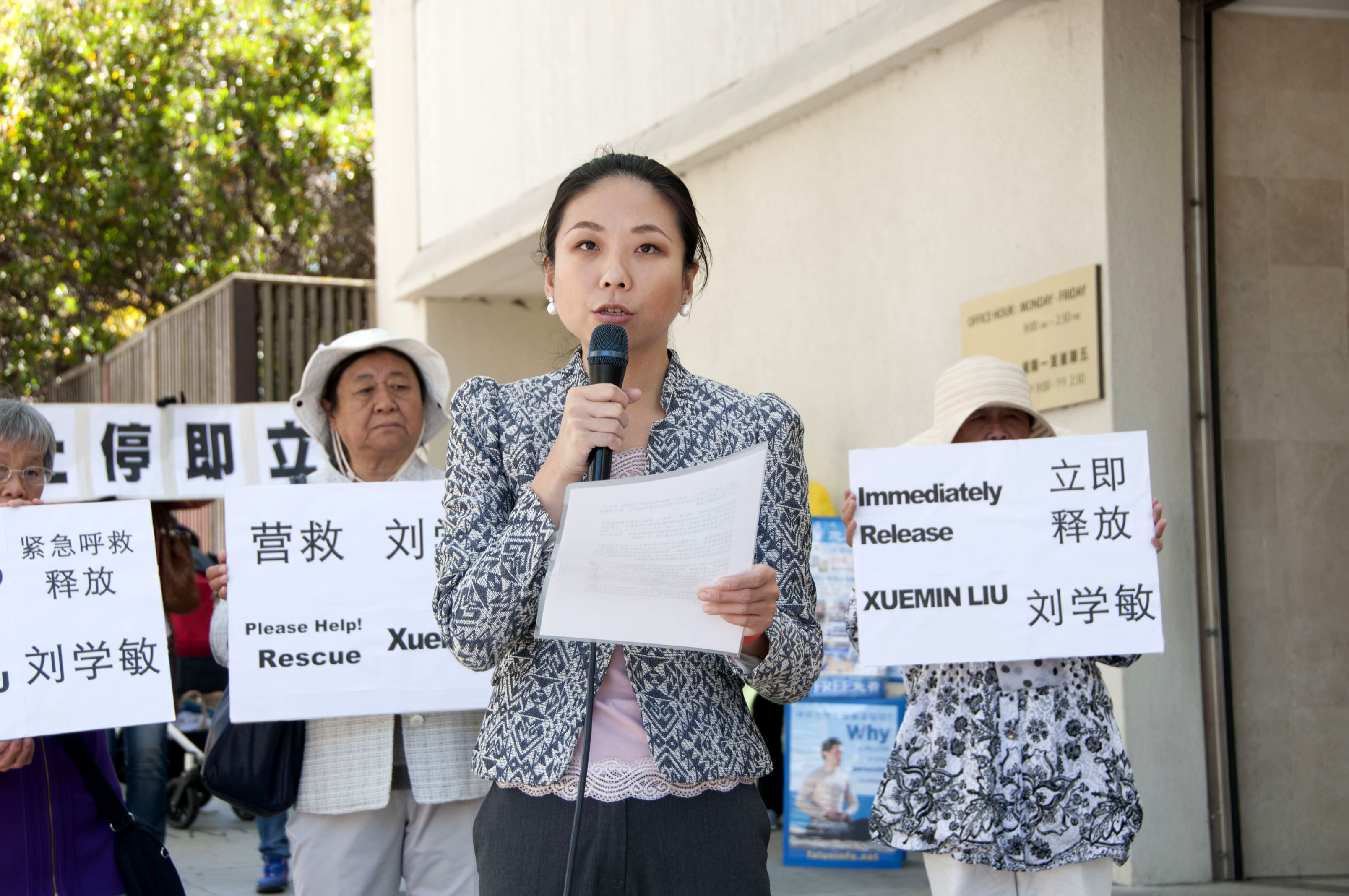 法轮功学员腊梅在集会上发言,营救法轮功学员侯宝琴