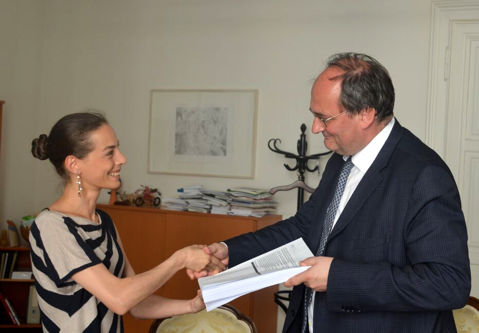 ![]() 图2:DAFOH代表Katja Hausmann (左)向人权专员Gerhard Doujak博士(右)递交一年来收集到的两百多万签名支持“制止强摘法轮功学员器官”的征签副本。 |