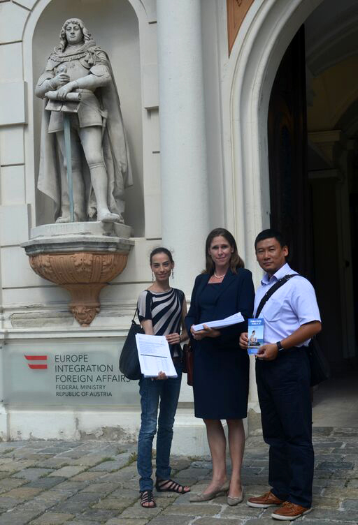 在此次会谈中,奥地利法轮大法学会主席王泳先生向Doujak博士介绍了当前的诉江大潮。而GFBV、DAFOH和法轮大法学会的三位代表,还将由奥地利为受威胁人民协会(GFBV)和“医生反对强摘器官”(DAFOH)组织共同发起的,为期一年的“制止强摘法轮功学员器官”征签活动所征集到的两百多万签名的副本,交到Doujak博士手中。同时呼吁奥地利政府进一步采取措施,帮助制止持续了十六年的中共对法轮功的迫害,和诉江大潮。