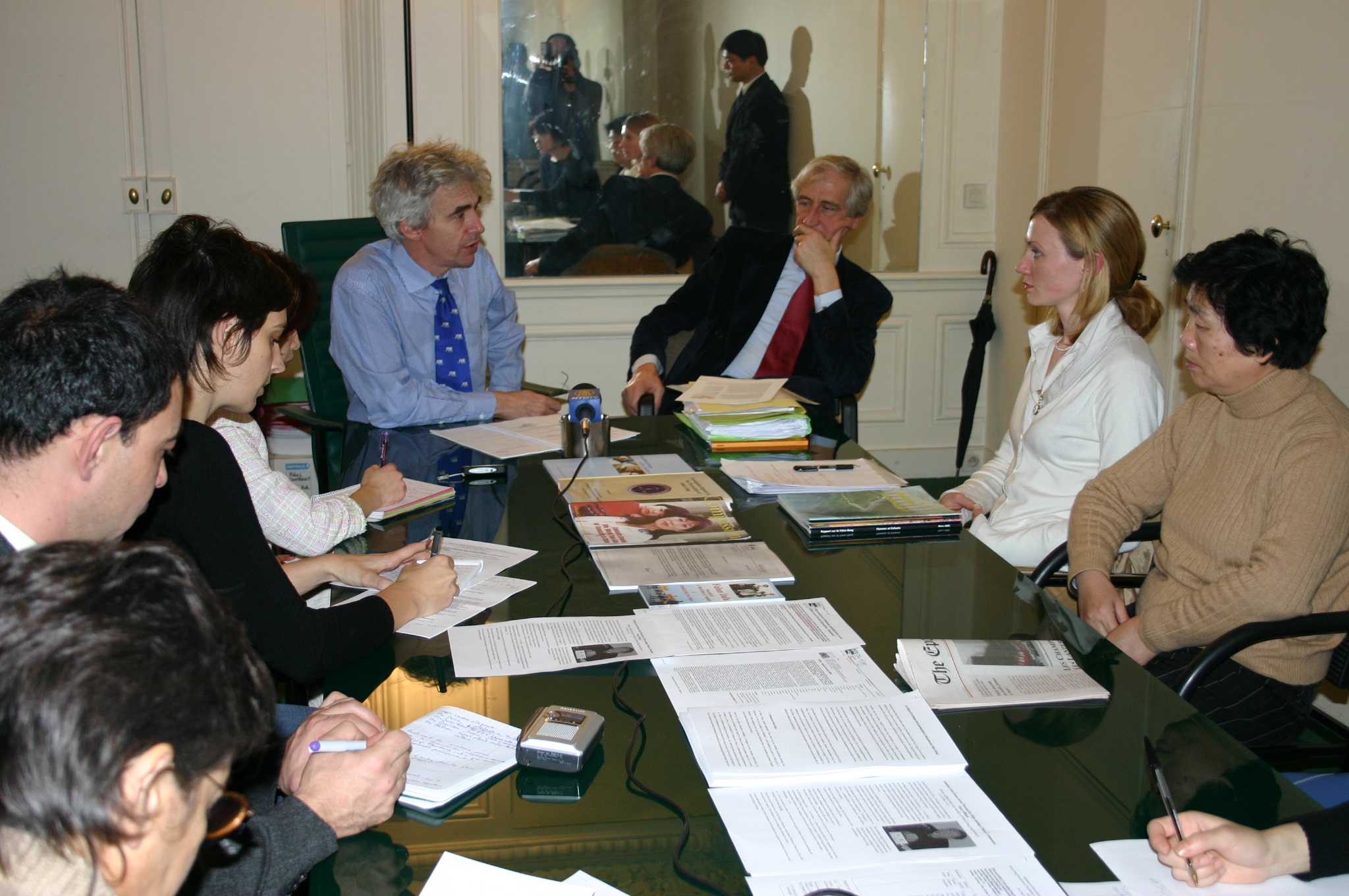 2004年12月16日下午5点,法国法轮大法协会与法国大律师William Bourdon(后左)和比利时大律师 Georges-Henri Beauthier(后右)在William Bourdon在巴黎的律师事务所召开记者会,介绍法国预审法官要求中国有关当局配合调查李岚清和孙家正在迫害法轮功当中所犯罪行。多家大媒体到场采访。