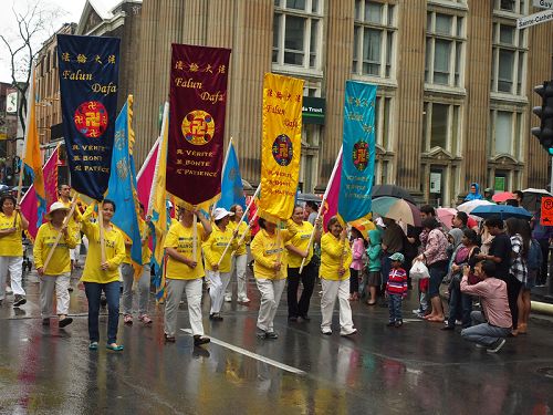 由蒙特利尔、渥太华以及附近周边城市的法轮功学员组成的天国乐团以及法轮功方阵,作为国庆游行阵的头阵,参加了今年蒙特利尔的加拿大国庆游行。观看游行的民众看到威风凛凛的天国乐团,以及慈悲祥和的法轮功彩旗及炼功方阵,发出阵阵赞叹,忙不迭地按动相机快门留下珍贵的照片。
