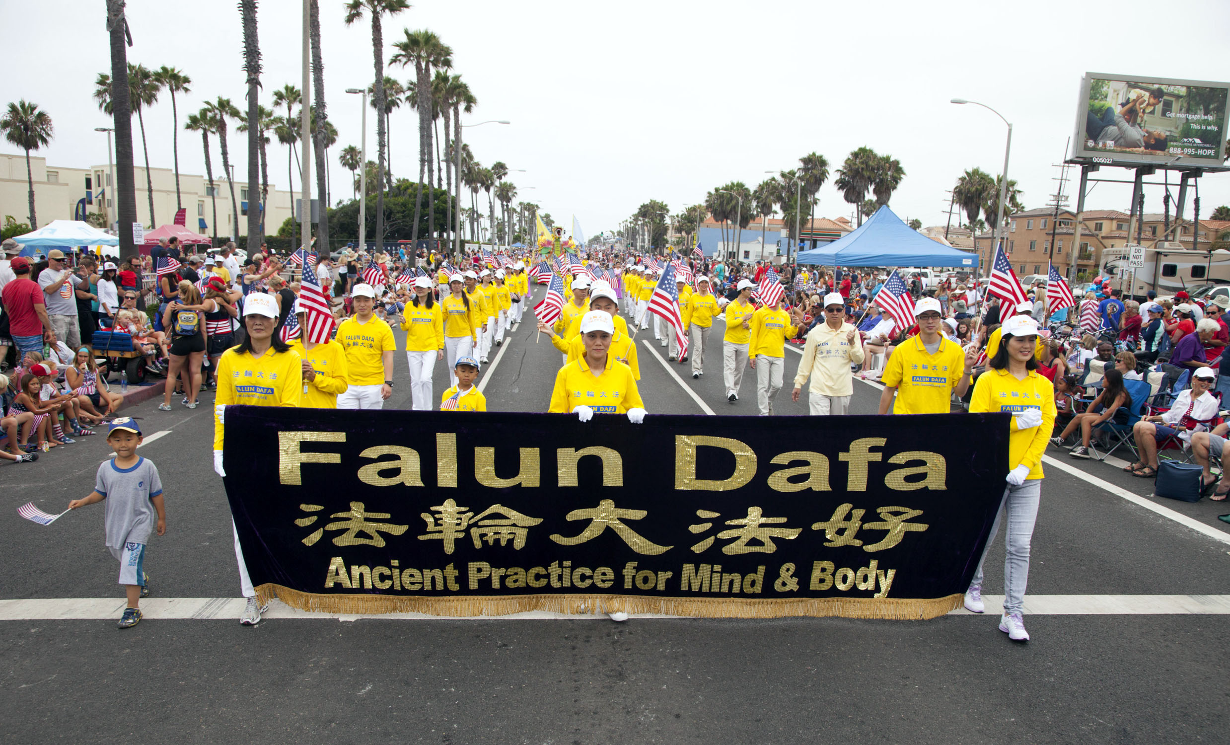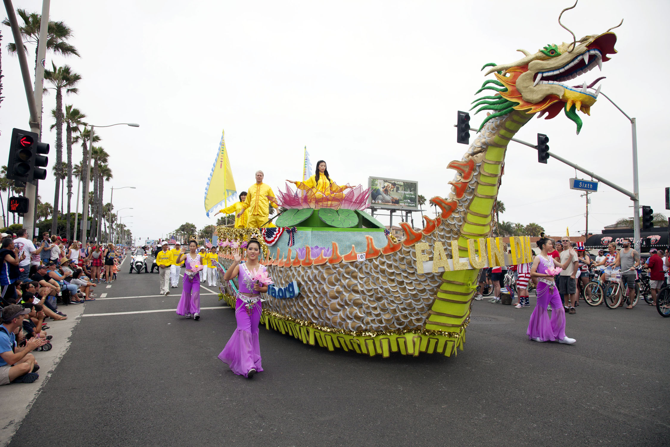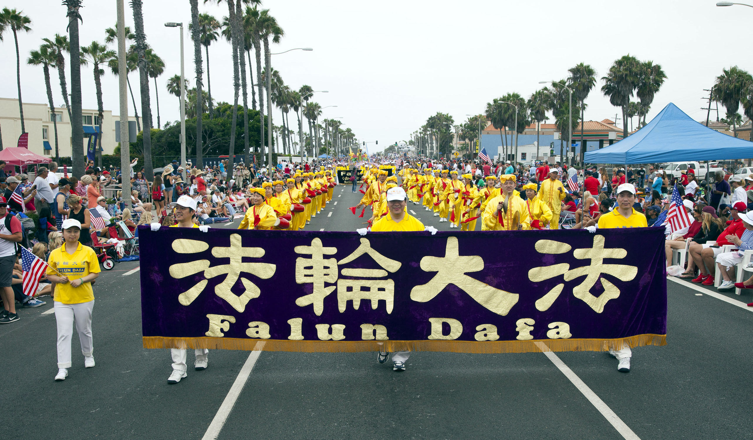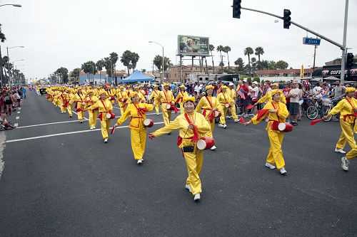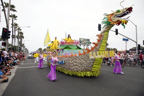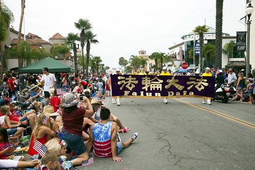 在参加游行的上百个团体中,由法轮功学员组成的队伍是唯一华人队伍,印有“法轮大法”的巨大横幅和身着醒目的金黄色传统服装的腰鼓队,以及跟随其后,能“吞云吐雾”、载着演示功法的学员的龙船,都受到两旁观众的欢迎。有的观众表示,法轮功都队伍令人印象深刻。