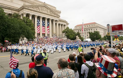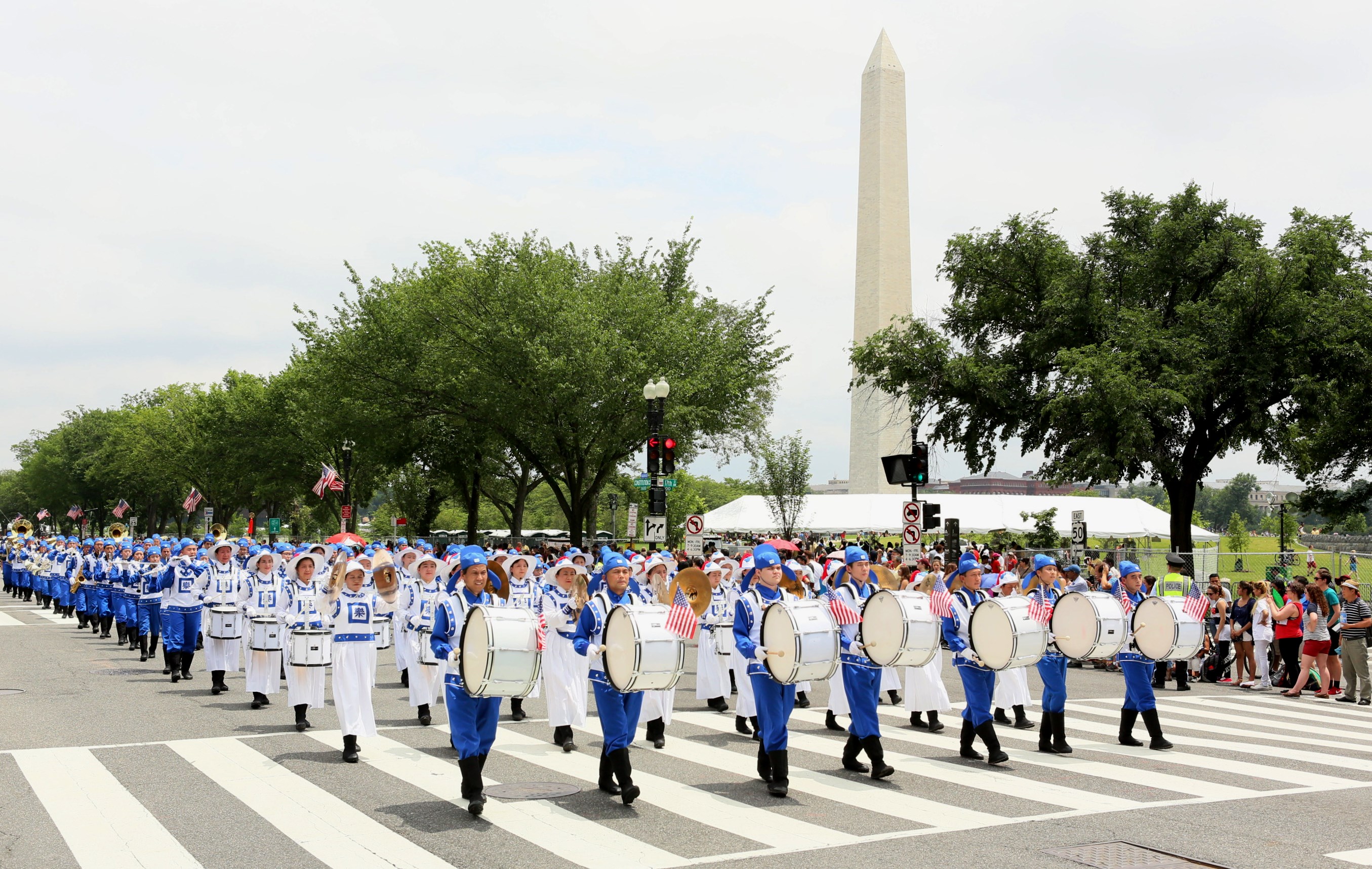 伴随着威武雄壮的鼓乐声,天国乐团踏上宪法大道。乐团成员身着中国传统服饰,步伐整齐,他们演奏的《法轮大法好》、《星条旗永不落》等乐曲,获得现场观众的阵阵喝彩。