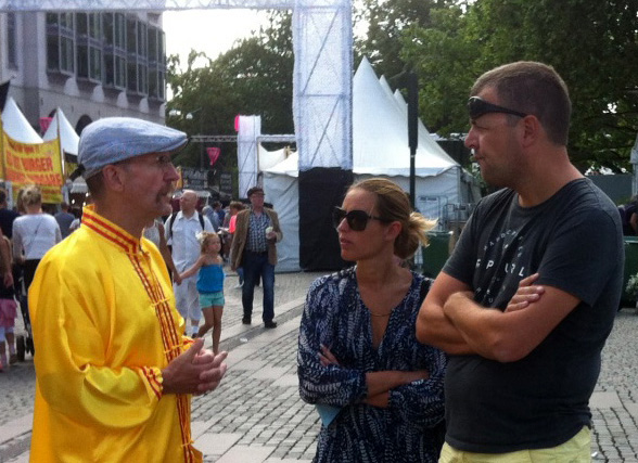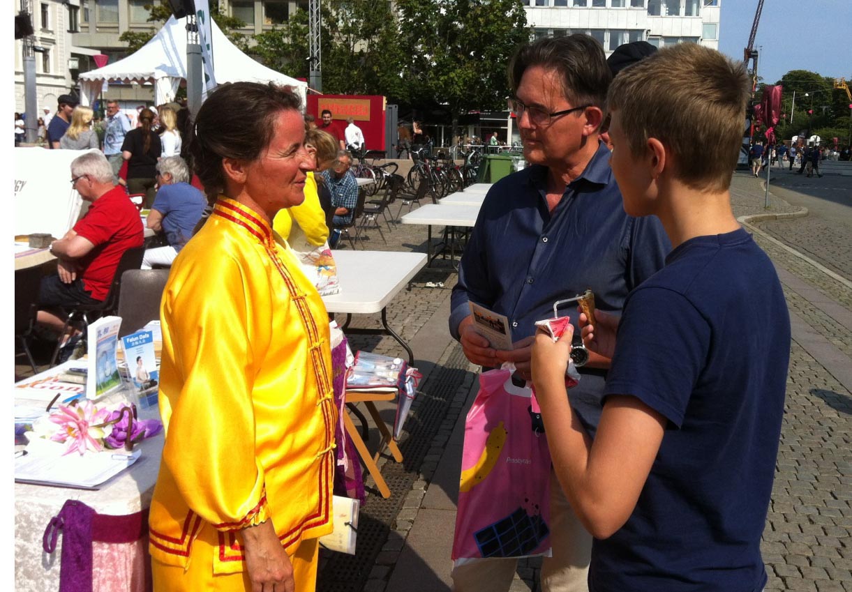 还有一对来自中国东北的父女,女孩在瑞典留学。这对父女在展位前驻足观看了很久,女孩对学员说她想学炼法轮功,并询问在哪里可以参加集体炼功。女孩的父亲表示支持,说在中国不敢炼,在这里很自由。