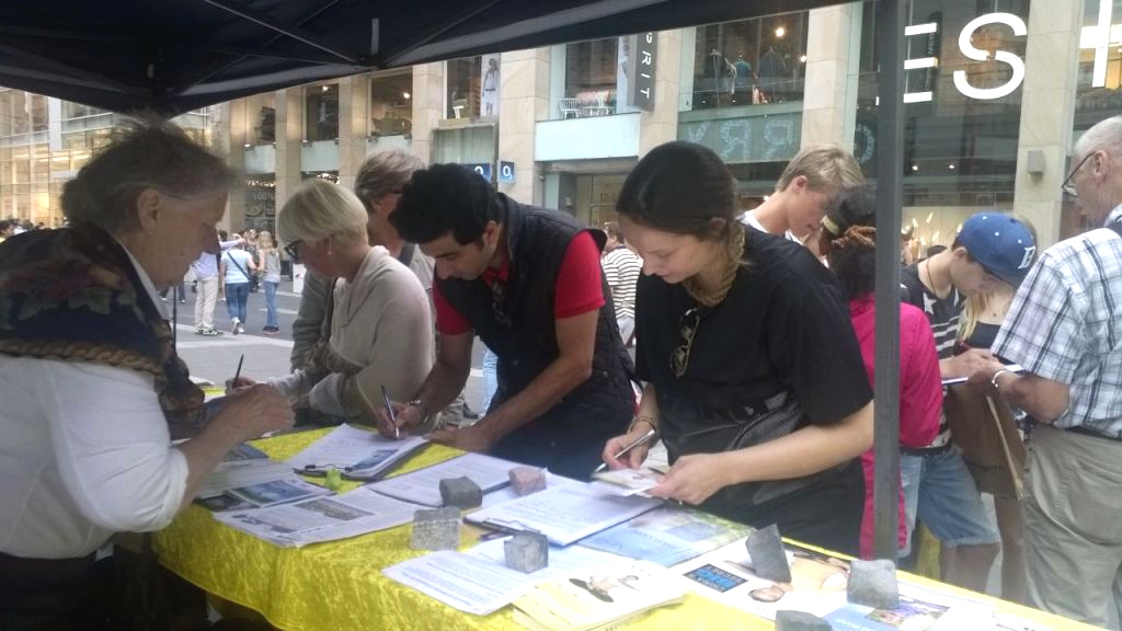 经过集会现场,很多人停下了匆忙的脚步,仔细倾听着学员的发言。也有不少人先拿了真相资料,办完事了之后再回来表示支持。明白了真相的人们纷纷签名反对中共对法轮功的迫害,谴责中共活摘法轮功学员器官的罪行,支持全球控告元凶江泽民。也有中国人听说了超过十四万人控告江泽民,觉得很吃惊,也很高兴,想多了解一些真相。