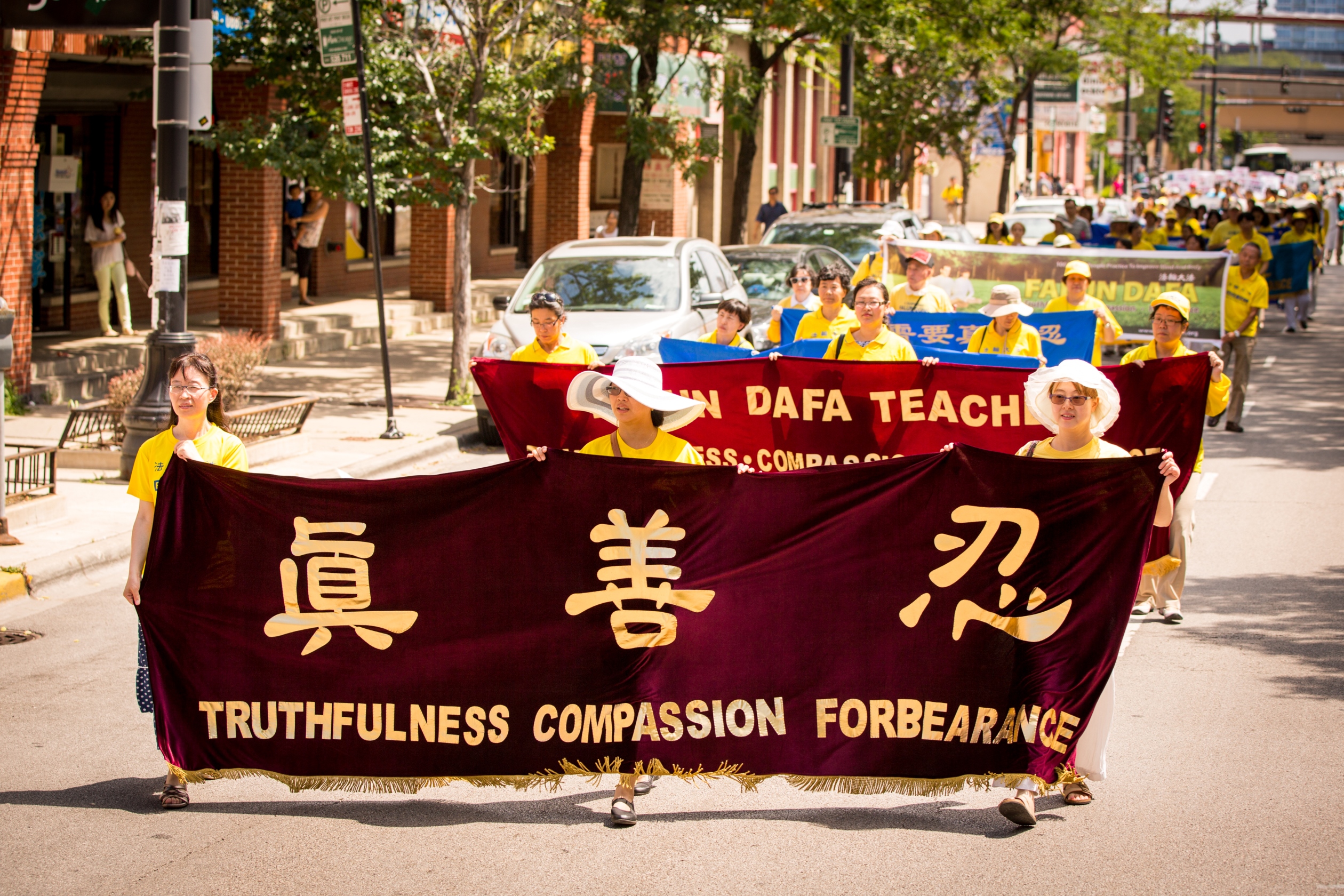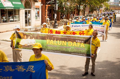 游行队伍沿芝加哥中国城主干道永活街一路向北,经过舍麦街和亚珠街再原路返回。沿路经过的地方,不少路人拿起手机拍照,有的向法轮功学员真诚地微笑致意,还有的伸出大拇指表示赞许。