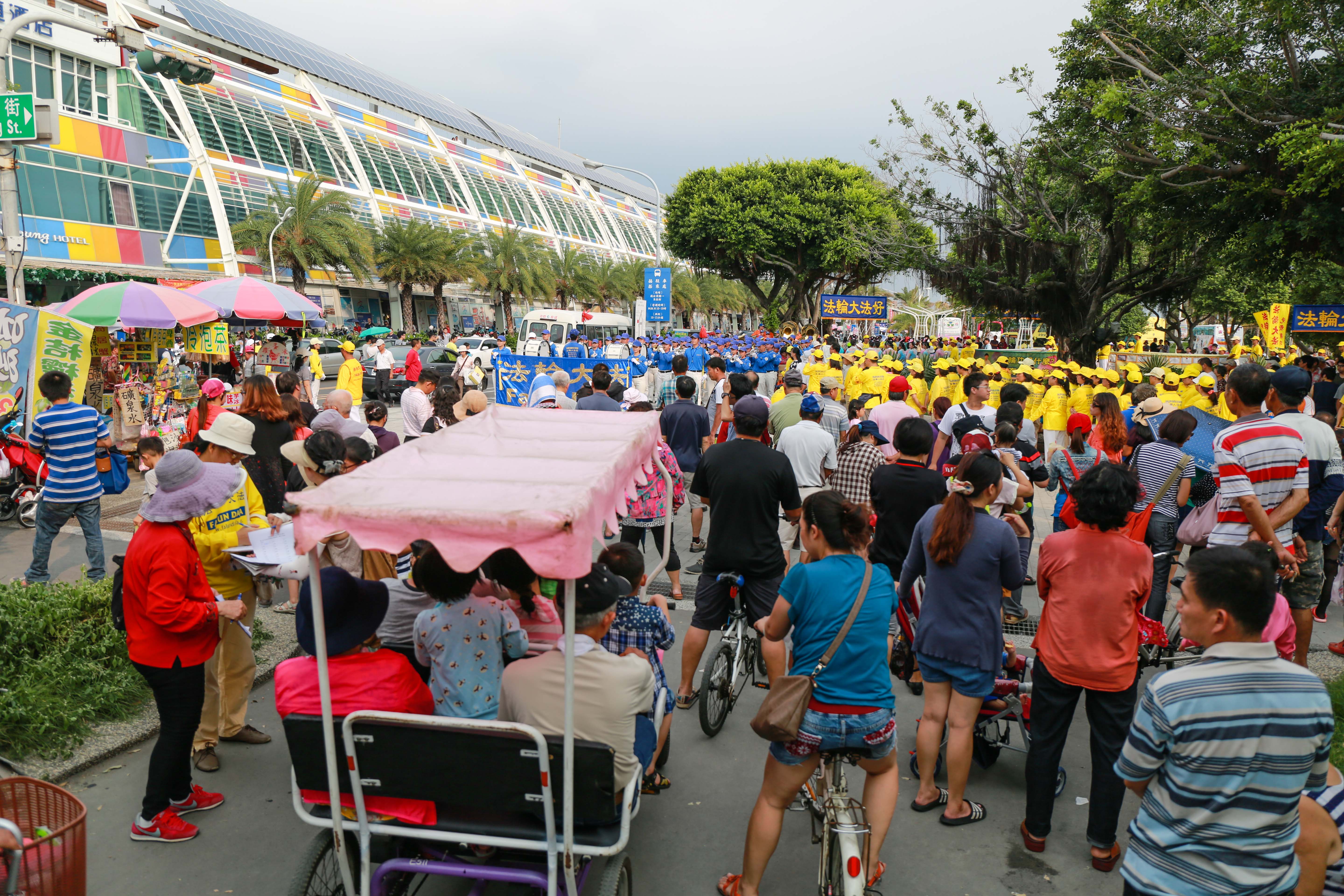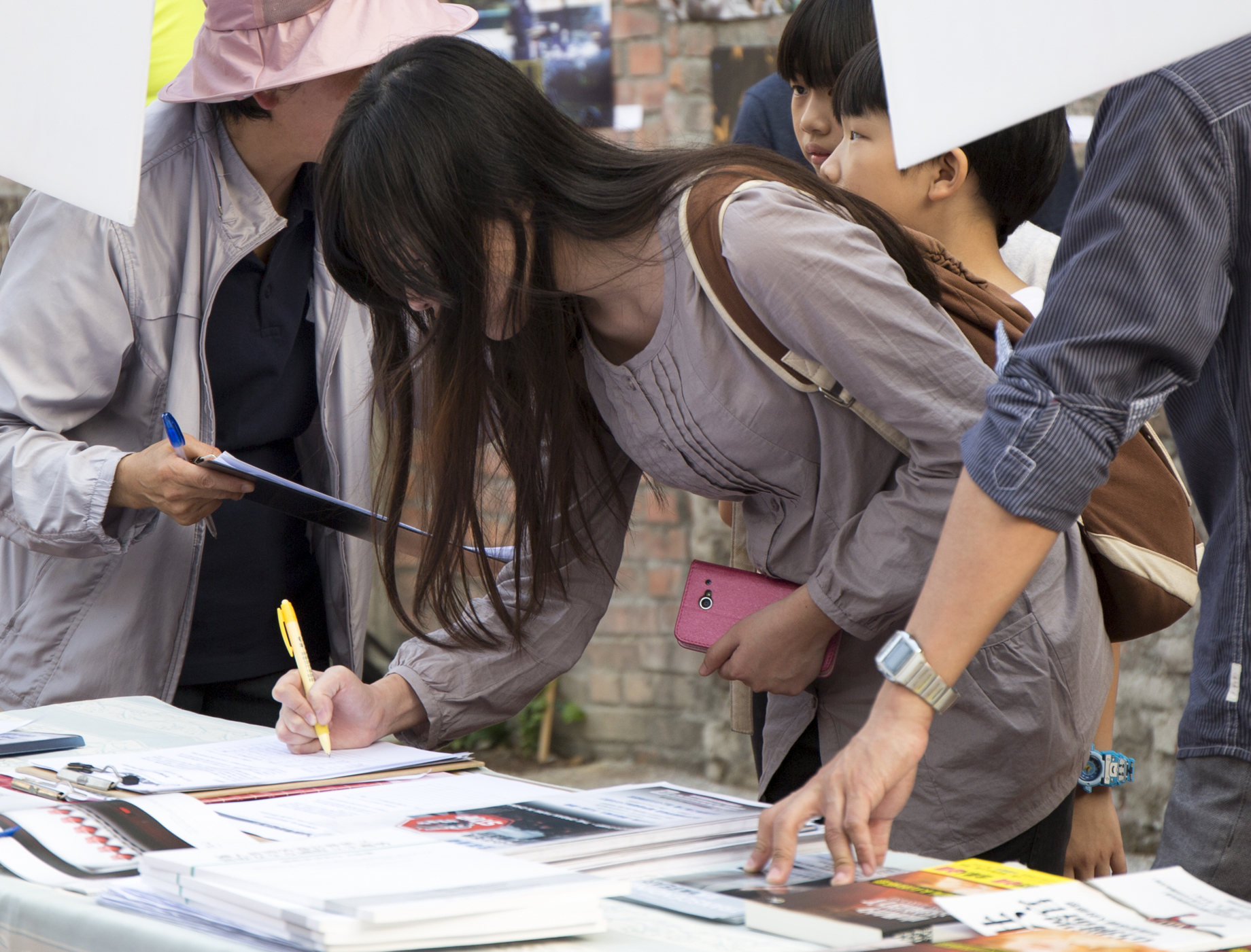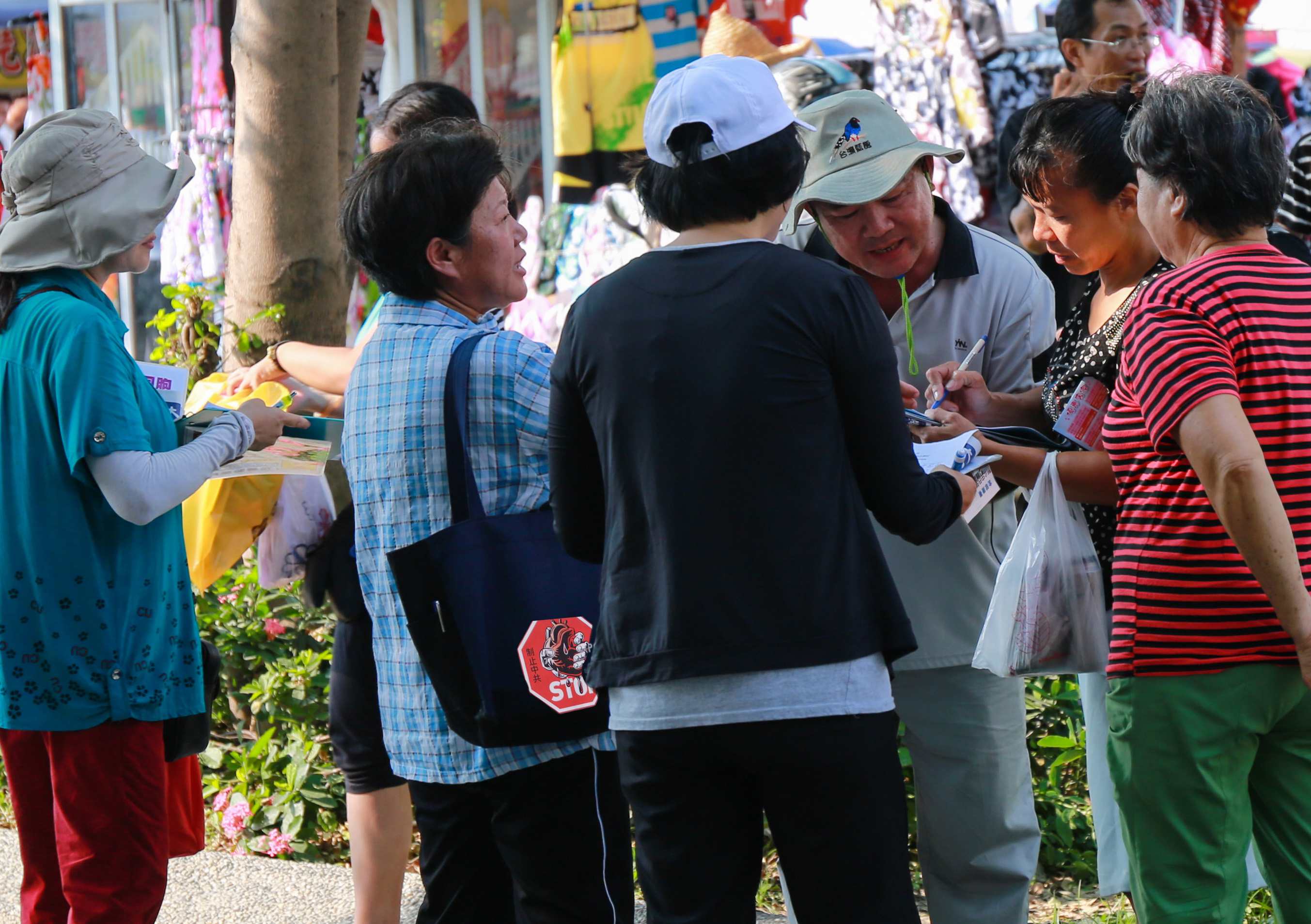 图3-9:高雄市法轮功学员设展位向民众征签,制止中共迫害法轮功,民众响应热烈。了解真相的人们纷纷签名,期盼早日将恶人绳之以法。