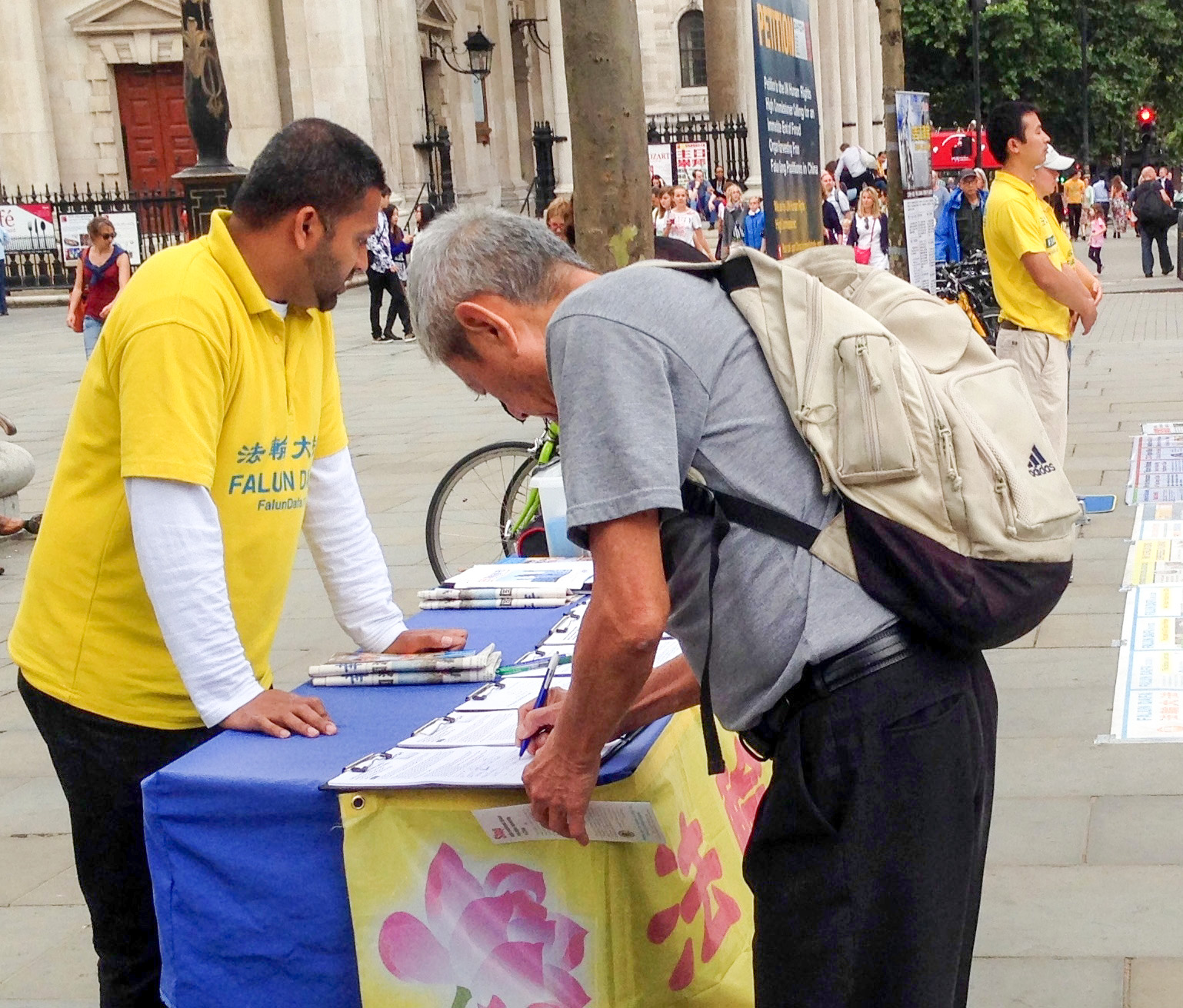 ![]() 八月二十九日,在伦敦圣马丁广场,一位已经了解法轮功真相的马来西亚华人径直去签名反迫害 |