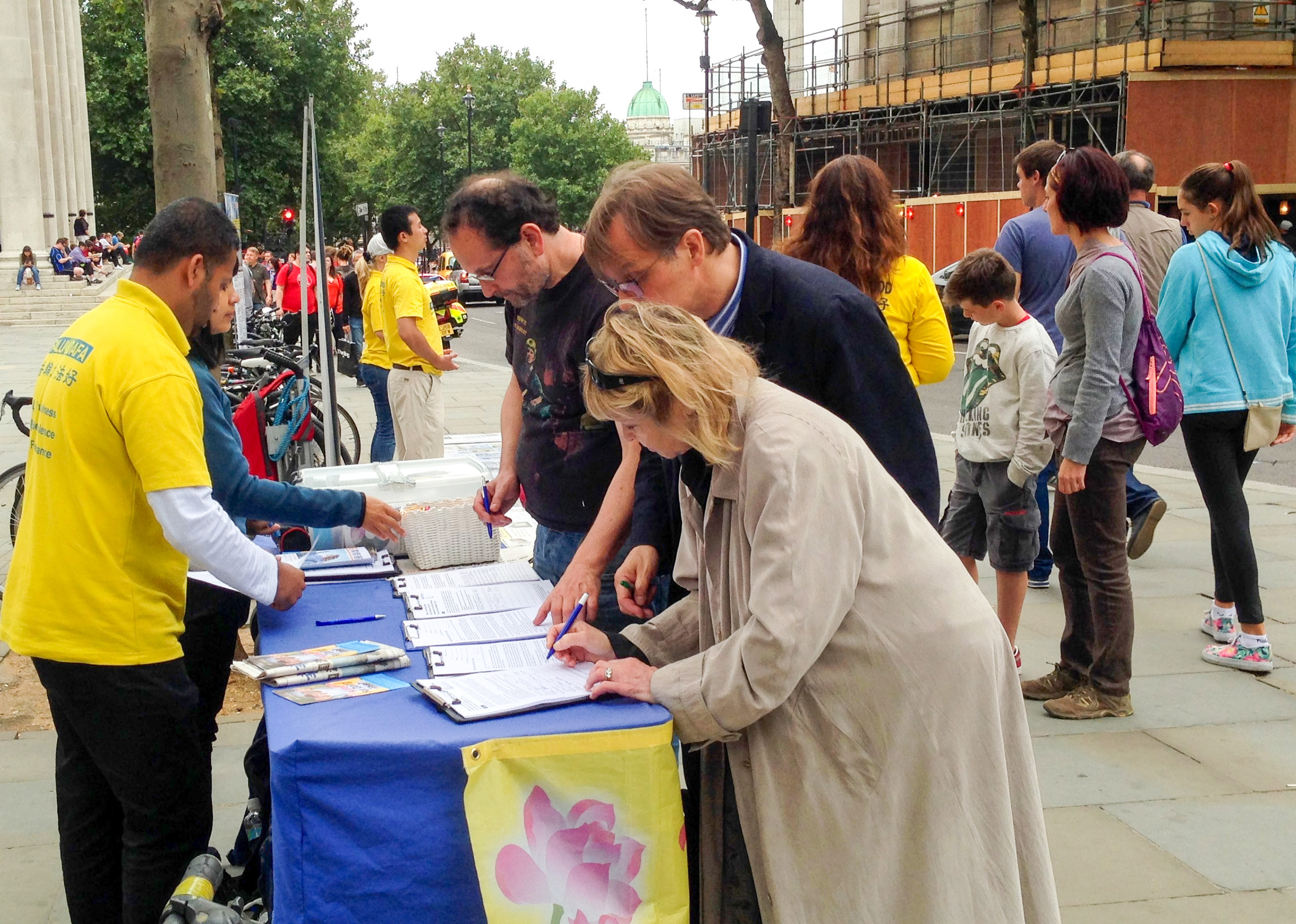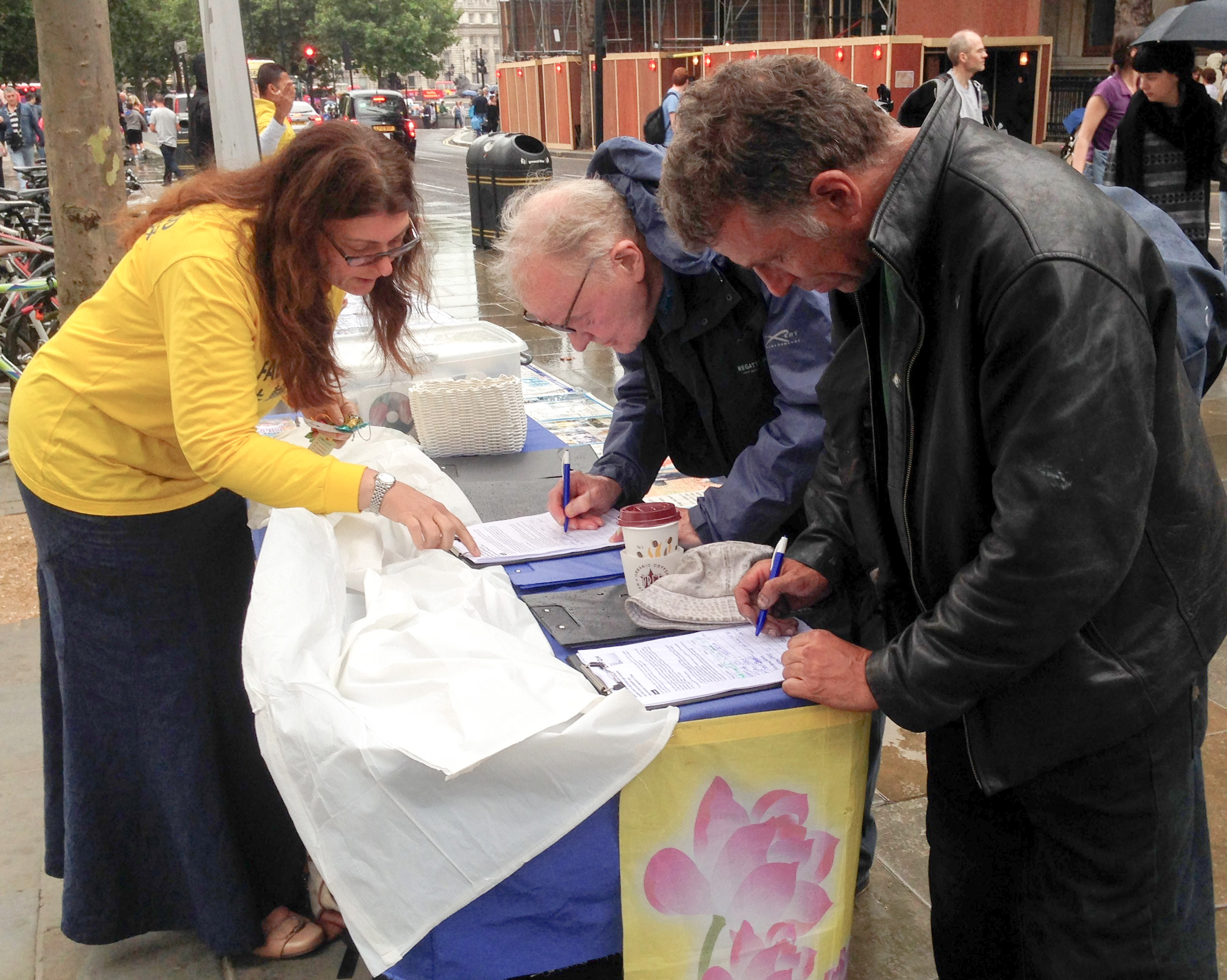 上了年纪的英国夫妇约翰和乔伊途径圣马丁广场时,带着受到震惊的表情驻足在反活摘征签的展板前,观看一段时间后先后在征签表上签了字,并主动与法轮功学员进一步交谈。约翰以前听说过迫害,但这是他第一次听说活摘器官,他表示难以理解为什么中共如此残酷对待法轮功。于是法轮功学员向约翰夫妇解释了法轮功是什么,中共出于邪恶本质迫害法轮功、企图消灭法轮功的真相,告诉他们大规模活摘法轮功学员器官牟利是中共发动主导的国家犯罪,是反人类的罪行。听到这些,约翰夫妇表示更明白了真相,认为活摘器官太糟糕了,不该发生,他们支持法轮功反迫害。