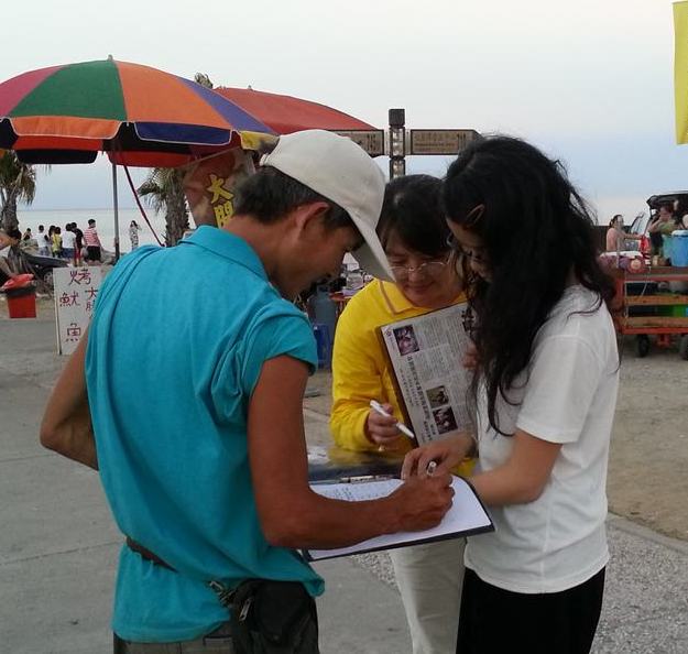 【明慧网二零一五年八月五日】二零一五年八月二日,台湾花莲县法轮功学员在七星潭设立真相展位,向人们传递法轮大法真善忍的美好信息,揭露中共活摘法轮功学员器官的罪恶,民众明白事实真相后纷纷签名举报江泽民迫害法轮功的滔天恶行。自七月一日至八月二日,仅花莲县即有4857人签署刑事举报书,声援全球的诉江大潮,共同谴责中共暴行。