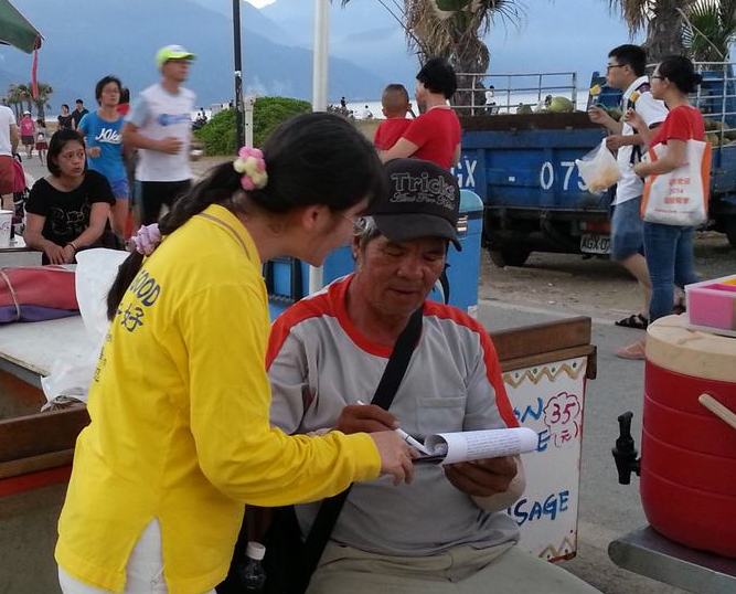 一群来花莲游玩的旅客表示:“这个(法轮功)很好,我们支持你们。邪不胜正,正义会到来的。”他们全体都签了举报书。