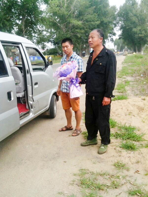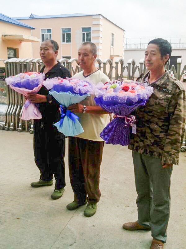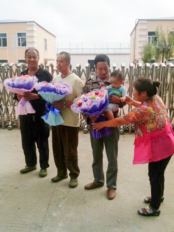 当张显录、杨井义和刘子平从拘留所院里出来时,他们的子女都上前送上花束,同修们将这珍贵的瞬间用手机拍上照片或录像。有的同修流下了泪水,感恩师父的加持和保护。此时,在拘留所门卫的工作人员看到同修们拍照,赶紧缩身躲进屋里,不敢露面。