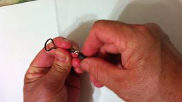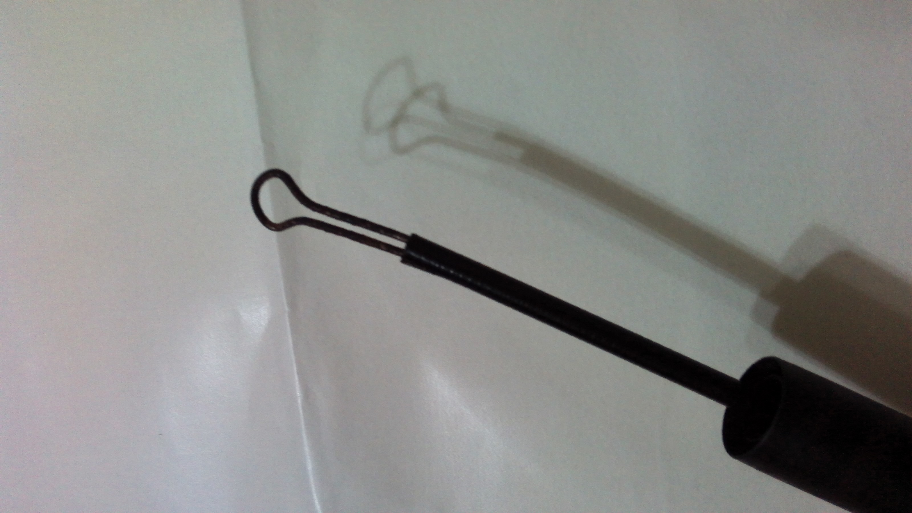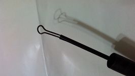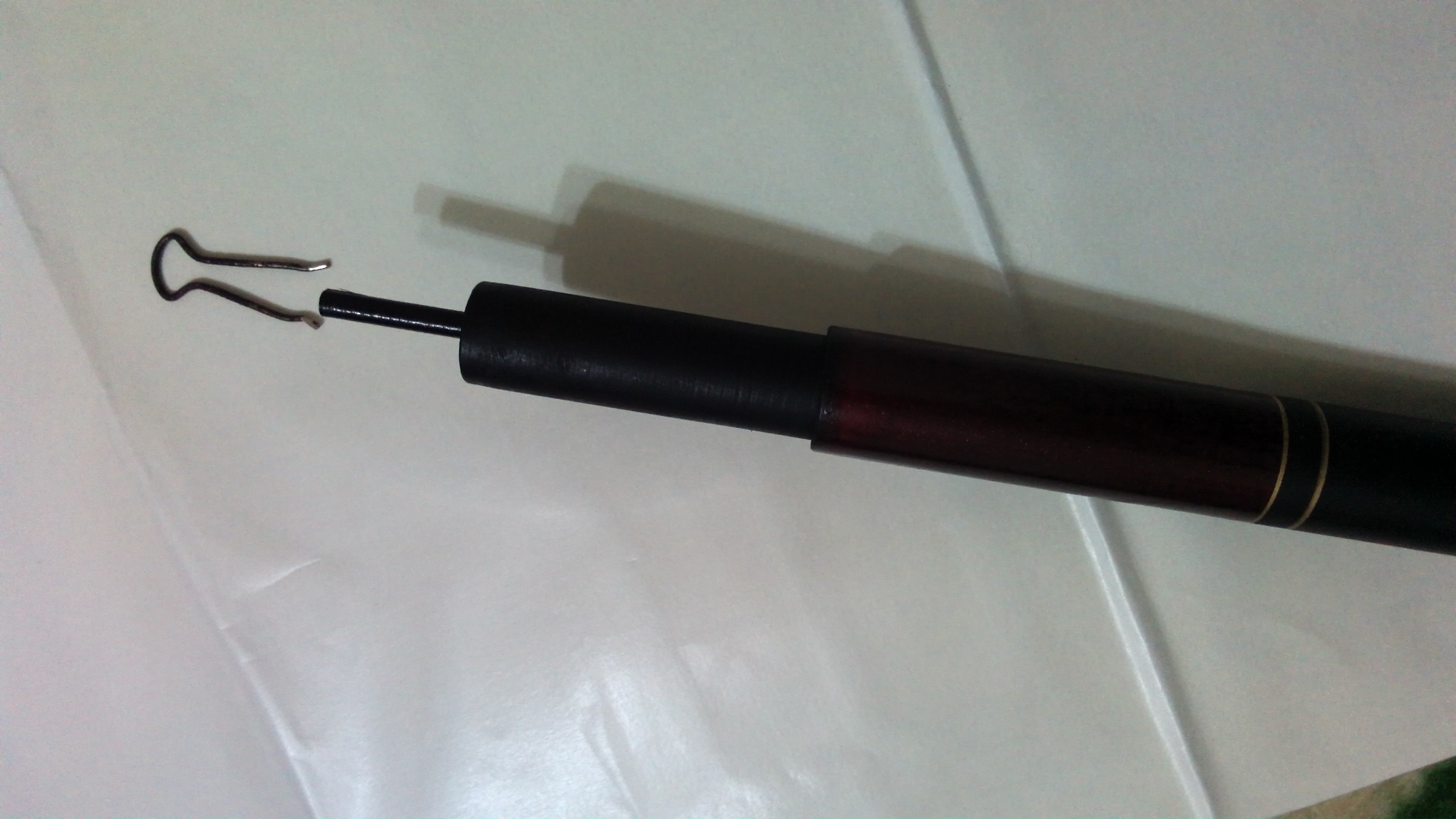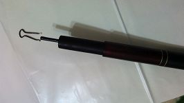 将细铁条从文具夹子上拆下,用钳子折一下,使其成Ω型,然后捏住圆形部分,将下端放入鱼竿的套筒中,松手,这样细铁杆就撑紧在鱼竿的套筒中了。