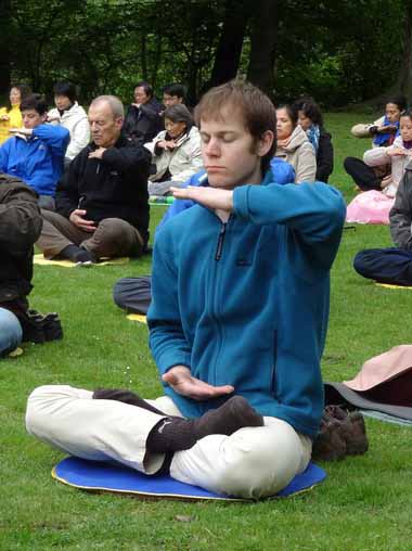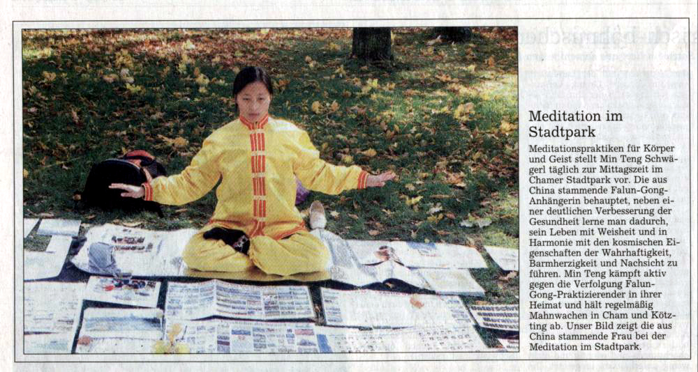 这是二零零九年十二月的一天。德国小伙子Michael经过卡姆(Cham)小城的市中心公园的时候,忽然发现一个女子在那里打坐,面前的草地上平铺着德文小横幅:“法轮大法”,“真善忍”,他简直不敢相信自己的眼睛。而这个打坐的不是别人,正是四年前组织九天班的法轮功学员敏。那一次他和其他人一起观看李洪志老师的讲法录像,学习炼功动作。他一听课就知道那正是自己苦苦寻找的修炼之路,大法大道,可是中间他几次因为其他事没有参加听课。他误以为修炼法轮功就不能恋爱结婚,就没有坚持下去。等他再去找敏的时候,敏已经搬家了。