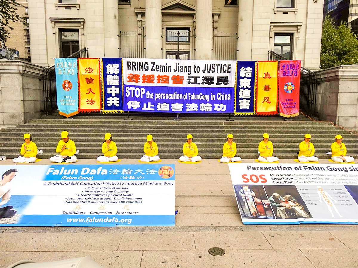 ![]() 图1:温哥华法轮功学员在温哥华市中心举行集会 |